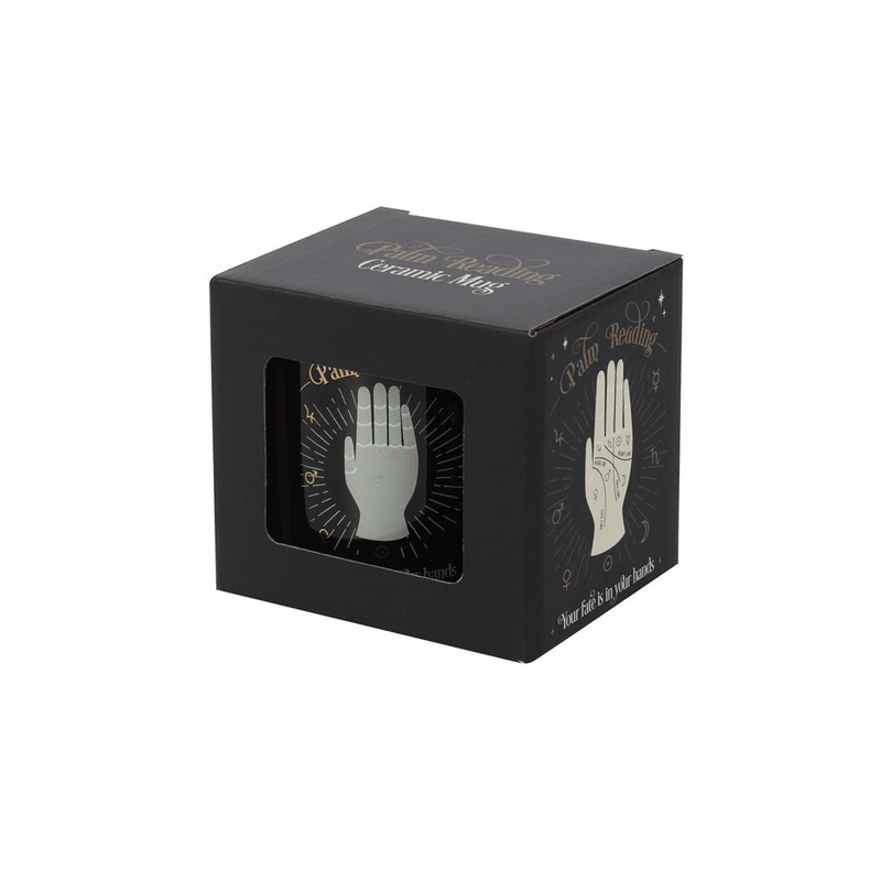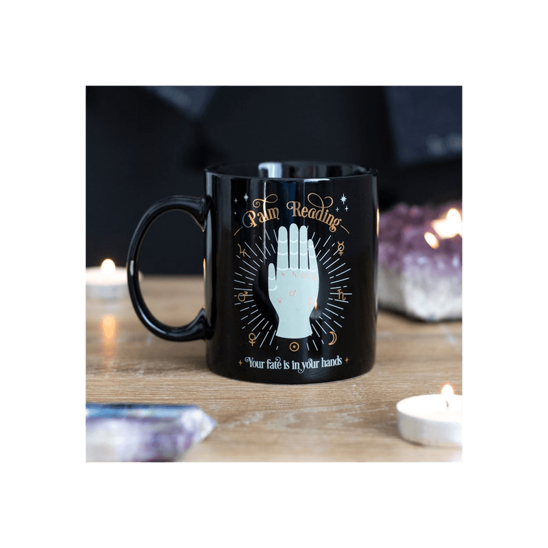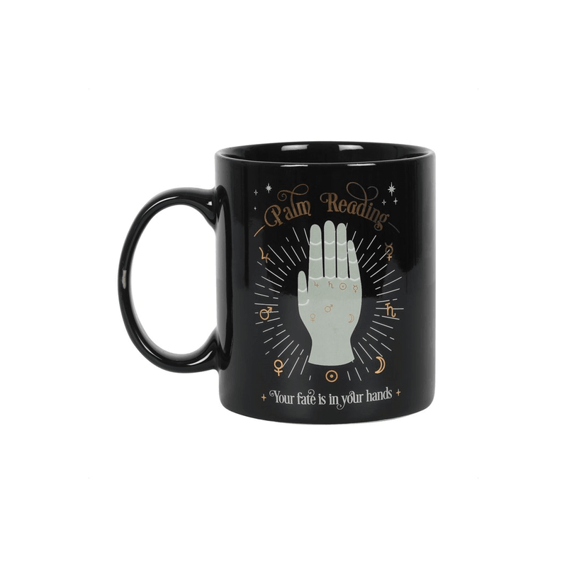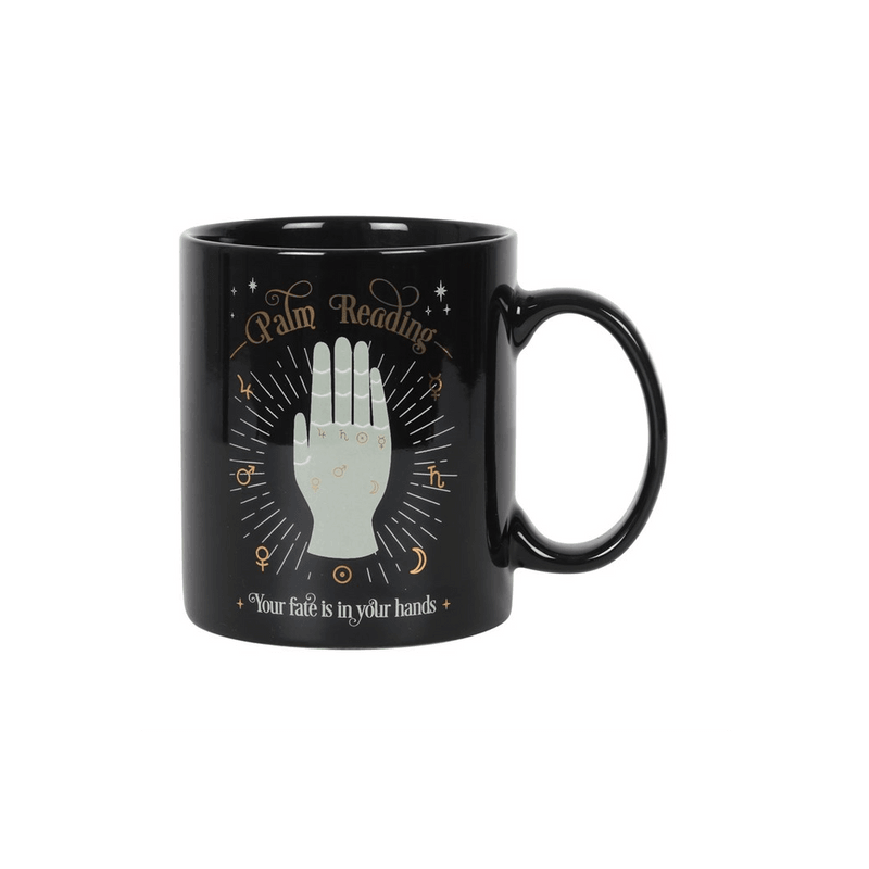 Stylish black mug with a stunning mystical fortune telling design, metallic gold details and the words 'Your fate is in your hands'. Microwave and dishwasher safe. Product Dimensions: H9cm x W12cm x D8cm Packaged Dimensions: H10.3cm x W11.5cm x D9cm
