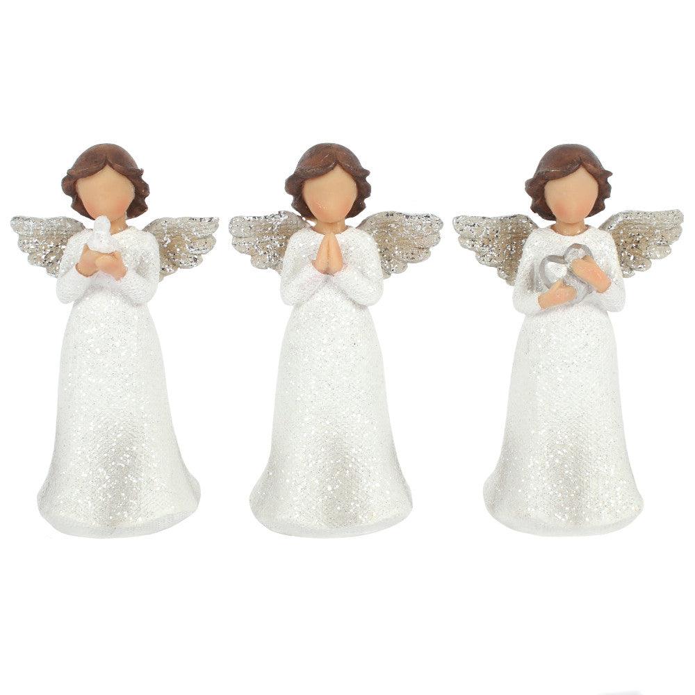 Beautiful trio of young angels with a subtle glittering finish. The first angel holds a white dove to symbolise peace, the second holds her hands in a praying position and the third holds a silver heart to represent love. Product Dimensions: H11.5cm x W6.5cm x D4cm Packaged Dimensions: H16.5cm x W16.5cm x D7cm