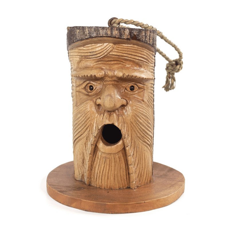 Handcarved from pinewood in Bali, this incredible bird house has been inspired by the Green Man. String from a tree branch to encourage birds into your garden. Product Dimensions: H28cm x W19.5cm x D19.5cm Packaged Dimensions: H28cm x W19.5cm x D19.5cm