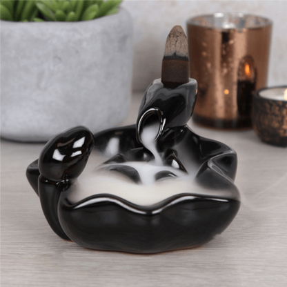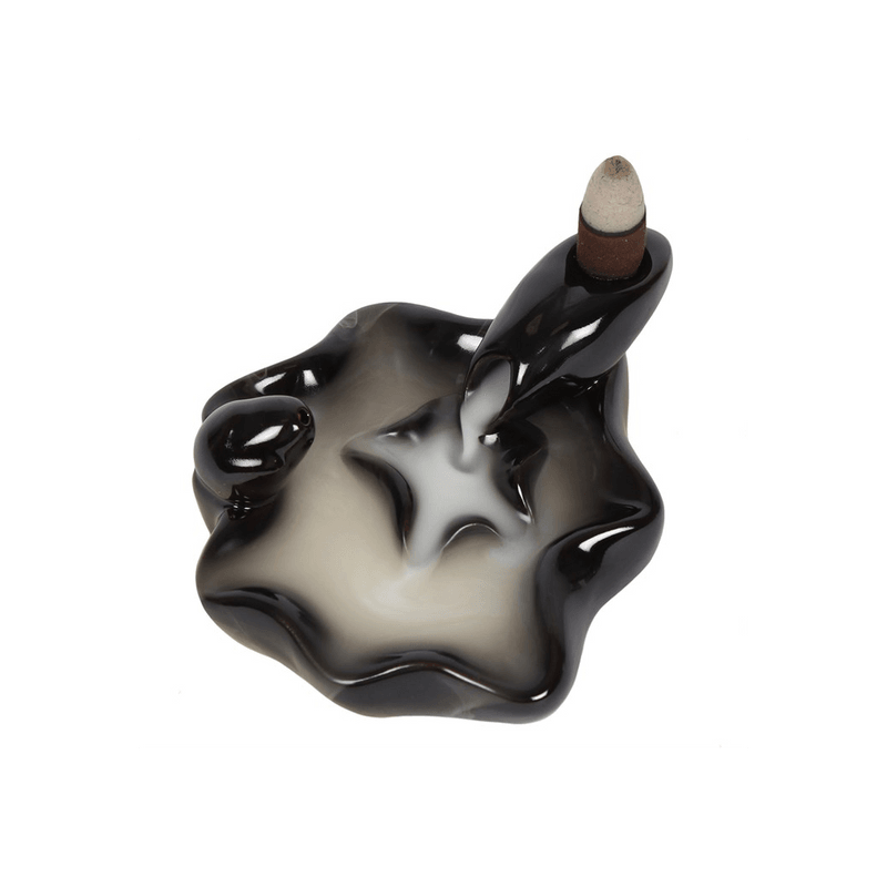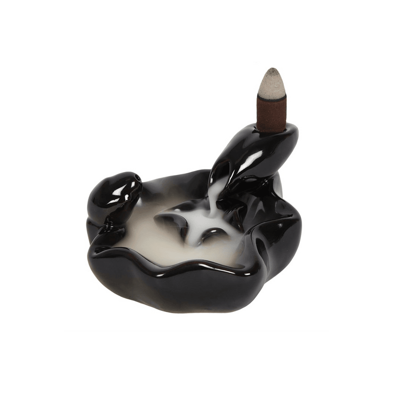 A stunningly simple black ceramic backflow incense burner in a pool to pool design.When the cone is lit the smoke from the cone pours downwards into the small pool then cascades in to the larger pool in a mesmerising waterfall effect. Beautiful to watch. For best effects burn indoors in an area away from any sudden air movements. Please note that after burning it is normal for a light oily residue to appear on the oil burner, for this reason we recommend protecting any furniture it is placed upon suitably. The residue can be easily wiped off the burner with a damp cloth. Please exercise caution when burning incense. Only backflow incense cones should be used with this product ? standard incense cones will not create the desired effect. It is normal for cones to take up to 10 minutes after being lit to start creating the smoking/mist effect. We supply a selection of backflow incense cones in a variety of scents. Product Dimensions: H6cm x W11cm x D12cm Packaged Dimensions: H8cm x W13cm x D8.5cm