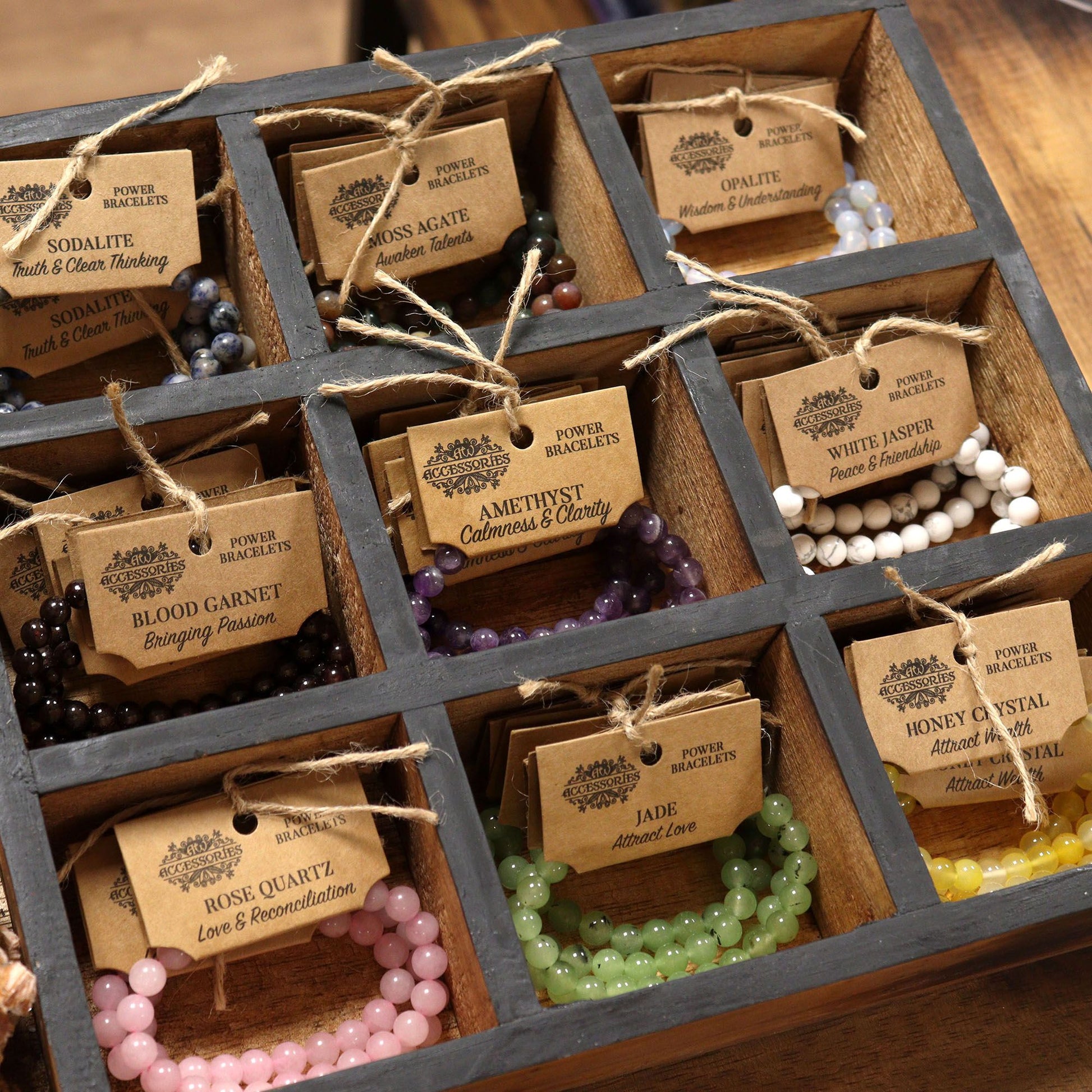 The Power Bracelet - Chakra Stones features Amethyst, Rock Quartz, Sodalite, Green Aventurine, Black Agate, Honey Crystal, and Carnelian. Each stone corresponds to seven different chakras, bringing a unique set of energies and benefits.