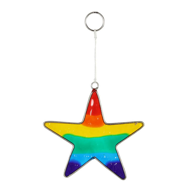 Colourful rainbow star suncatcher which is sure to brighten someones day. Hang in windows, convervatories or gardens for an uplifting splash of colour or use as a decoration during Pride celebrations. Product Dimensions: H9cm x W9cm x D0.1cm Packaged Dimensions: H9cm x W9cm x D0.1cm