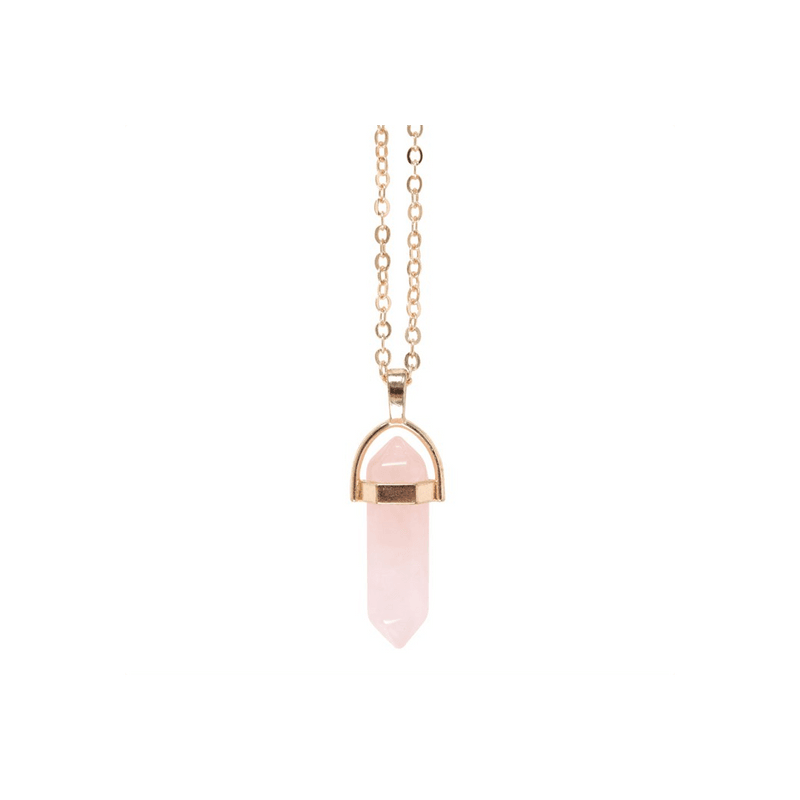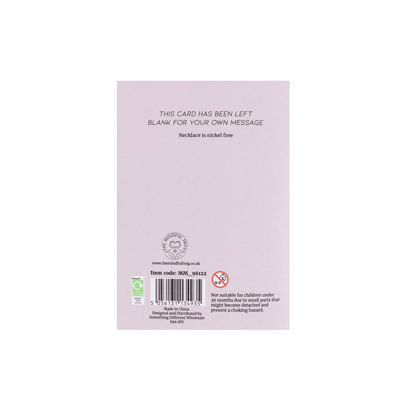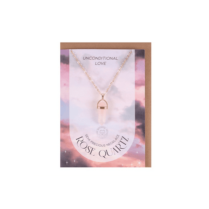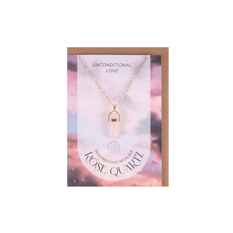 This lovely greeting card features a gold-tone necklace with semi-precious rose quartz crystal pendant representing unconditional love. 22cm chain with lobster clasp closure. Nickel-free stainless steel. Includes envelope. Card left blank inside. Product Dimensions: H16cm x W11.5cm x D1.2cm Packaged Dimensions: H16cm x W11.5cm x D1.2cm