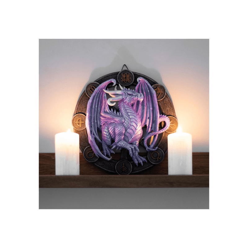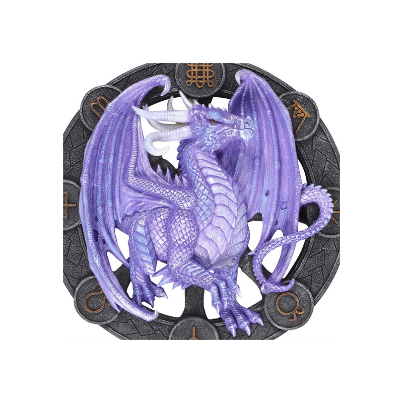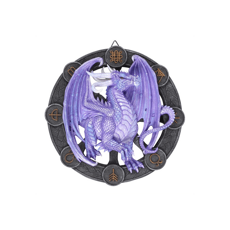 This exquisite resin wall art plaque showcases the captivating 'Samhain' dragon artwork, designed by the renowned fantasy artist Anne Stokes. The grand, purple dragon is depicted amidst a circle of sabbat symbols, with the symbol of Samhain proudly sitting above its horns. Samhain marks the festival of Hallows Eve - the final harvest of the year and a time for feasting, where the souls of deceased kin were beckoned to attend and a place was set for them at the table. This stunning piece of art is part of the exclusive 'Dragons of the Sabbats' series by Anne Stokes, and is sure to make a bold statement in any room. Product Dimensions: H27cm x W27cm x D4.2cm Packaged Dimensions: H31.5cm x W31.5cm x D8.5cm