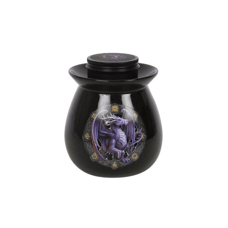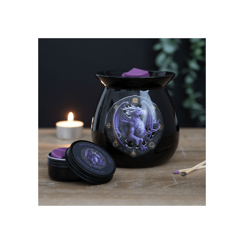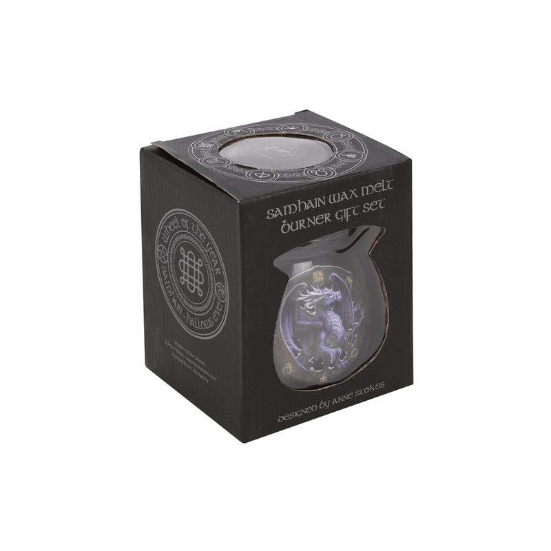 This beautifully presented oil burner and spice scented wax melt gift set features the 'Samhain' dragon design printed in high quality colour. Part of the 'Dragons of the Sabbat' artwork series by fantasy artist Anne Stokes.Product Dimensions: H11.5cm x W10cm x D10cm Packaged Dimensions: H14.5cm x W11cm x D11cm
