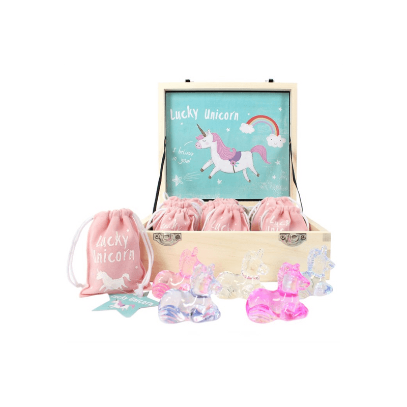 Carry a lucky glass unicorn with you wherever you go. These pretty glass unicorn ornaments come in 4 colours, pink, blue, purple and clear glass. They come in a free wooden display box with individual velevt carry pouches. Product Dimensions: H7.5cm x W20.5cm x D22.4cm Packaged Dimensions: H8.5cm x W23cm x D22.5cm