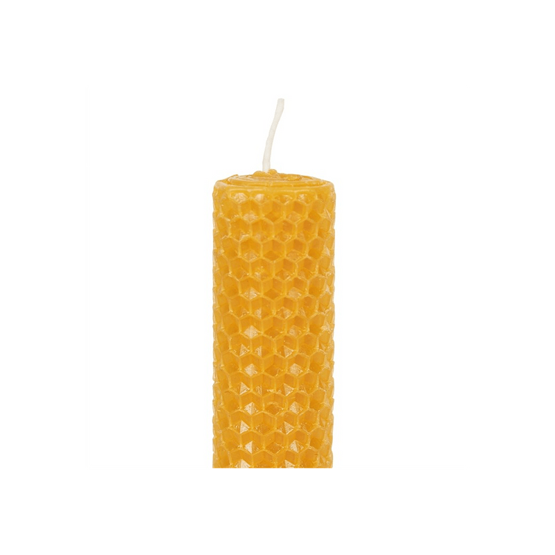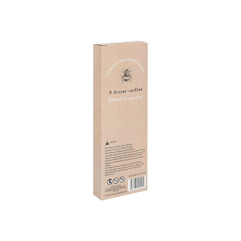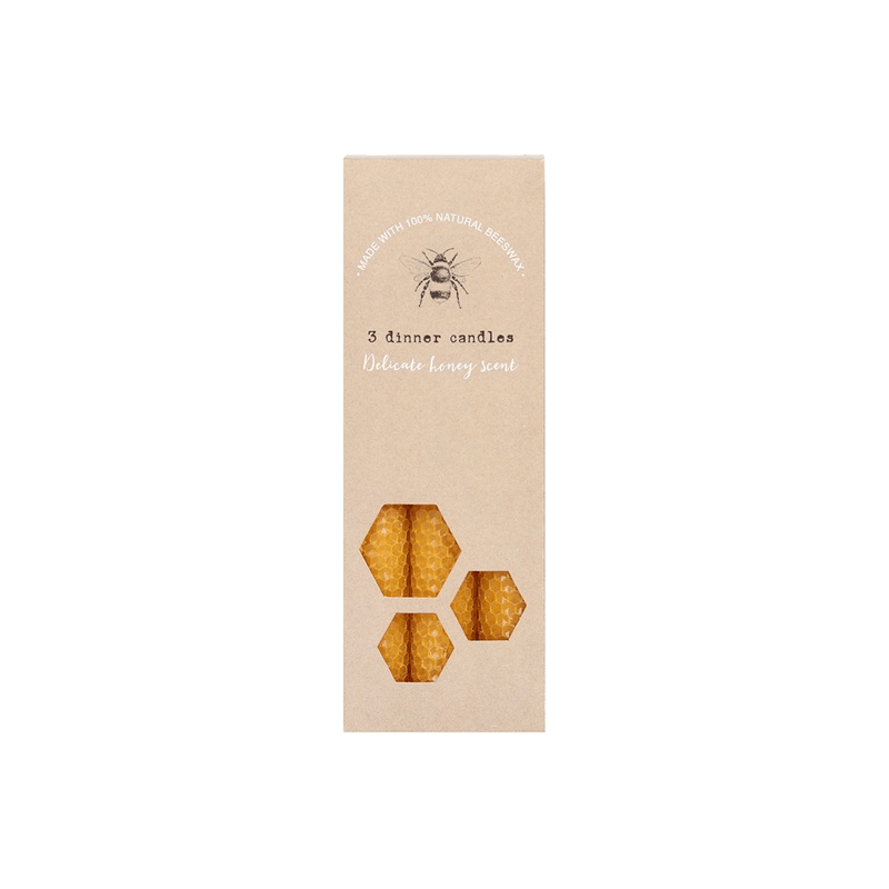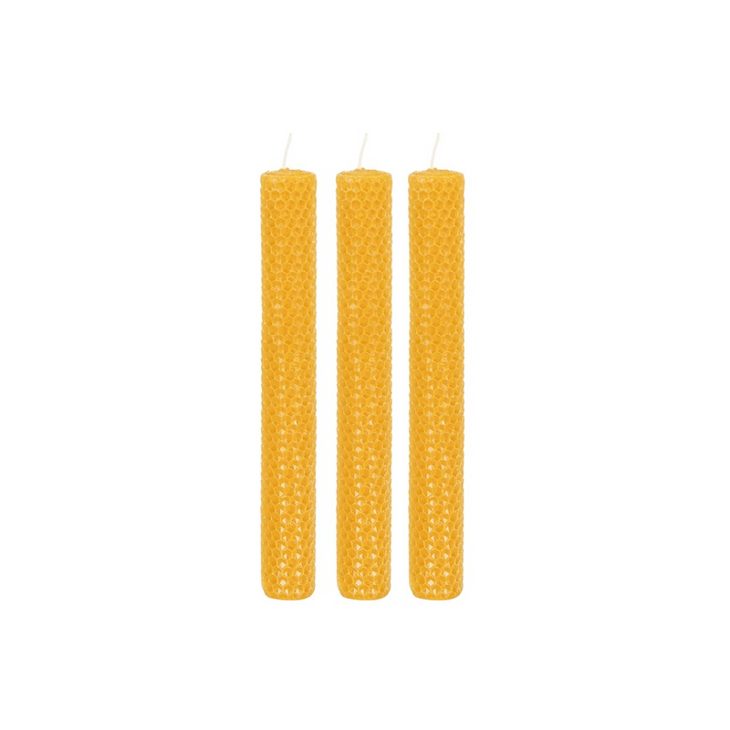 This set of 3 candle sticks are made with 100% natural beeswax in a rolled honeycomb texture. Approximate burn time of 3 hours. Delicate honey scent. 100% linen wick. Non-toxic. Do not ingest.Product Dimensions: H20cm x W3cm x D2.5cm Packaged Dimensions: H21cm x W7.5cm x D2.5cm
