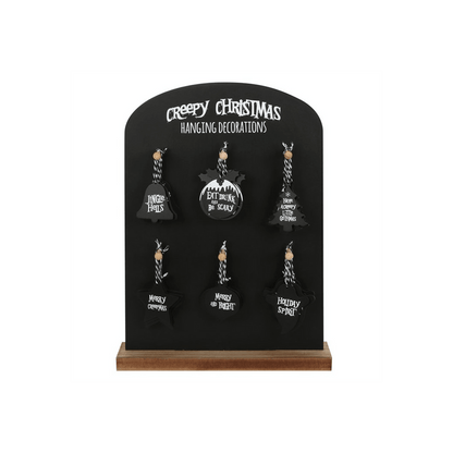 Set of 36 Creepy Christmas Hanging Signs on Display