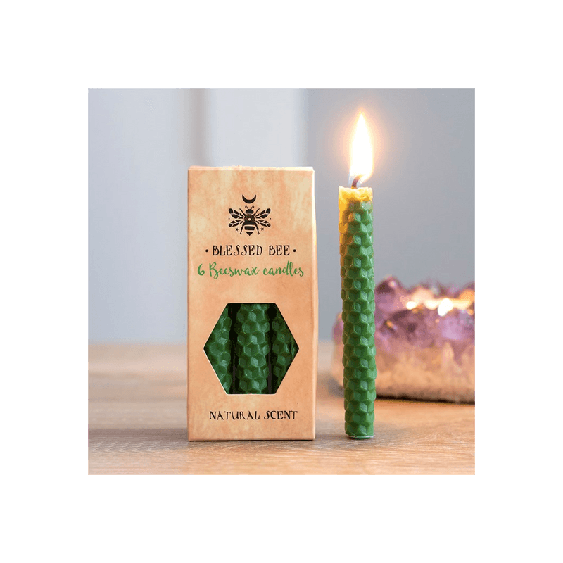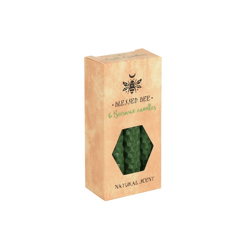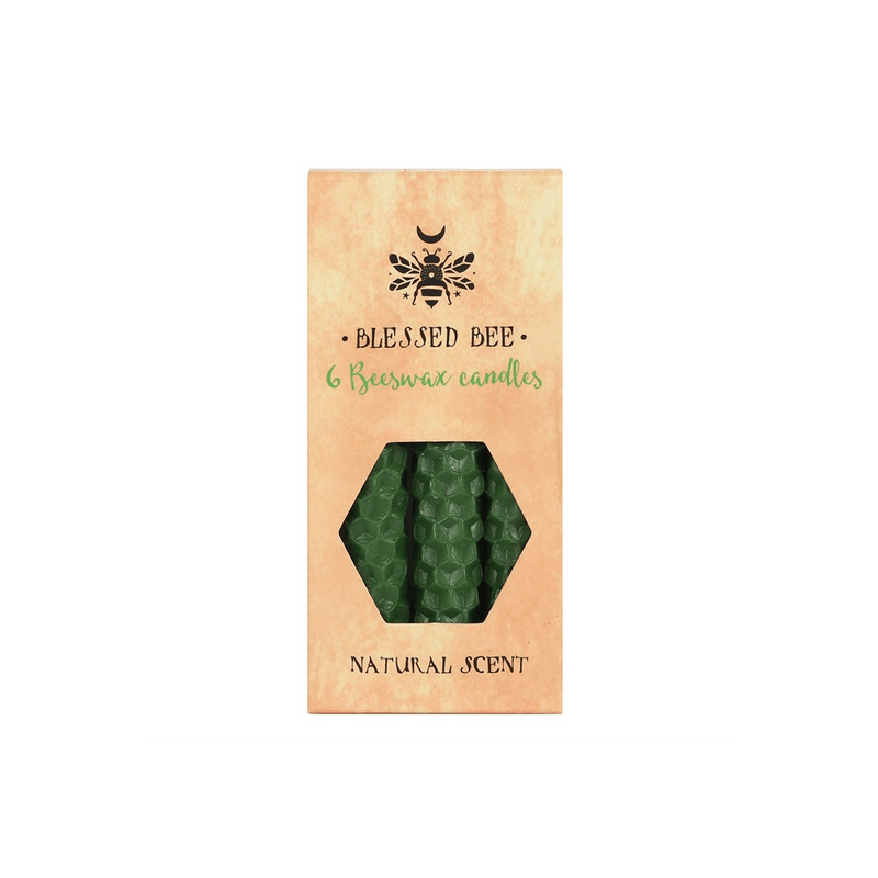 A box of 6 green Blessed Bee beeswax candles useful for spellwork involving luck and vitality. Light, natural scent. Approximate burn time of 1 hour. 100% linen wick. Non-toxic. Product Dimensions: H11cm x W5.5cm x D3cm Packaged Dimensions: H11cm x W5.5cm x D3cm