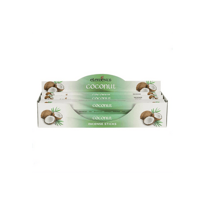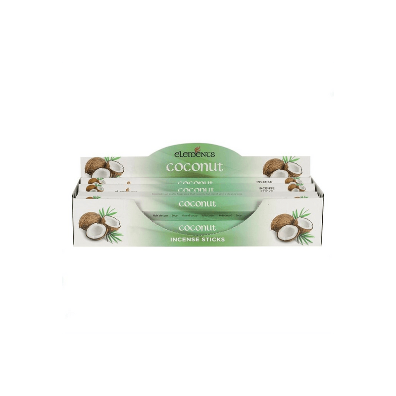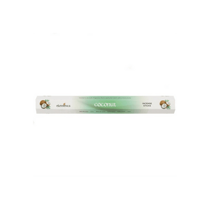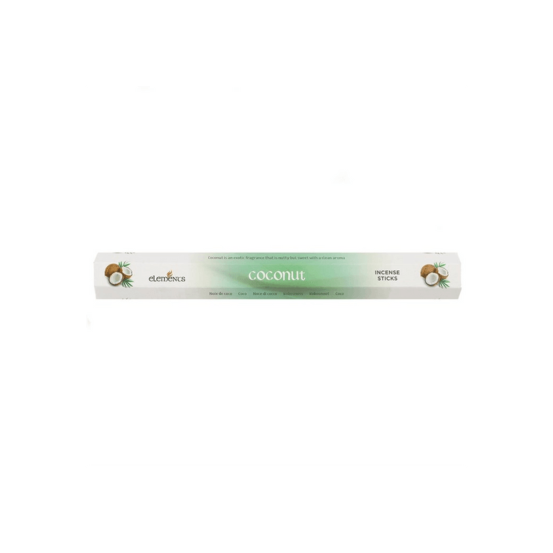 A box of 6 packs of Coconut fragranced incense sticks by Elements. Each pack contains 20 incense sticks. Product Dimensions: H2.7cm x W24.5cm x D3cm Packaged Dimensions: H5.5cm x W25cm x D9cm
