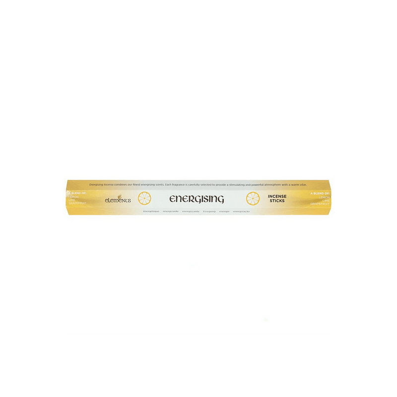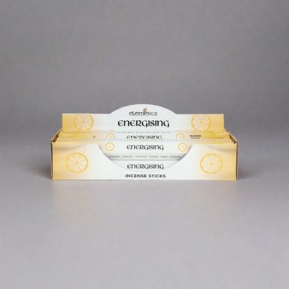 A box of 6 packs of Energising fragranced incense sticks by Elements which features notes of lemon, lime and grapefruit. Each pack contains 20 incense sticks. Product Dimensions: H2.7cm x W24.5cm x D3cm Packaged Dimensions: H5.5cm x W25cm x D9cm