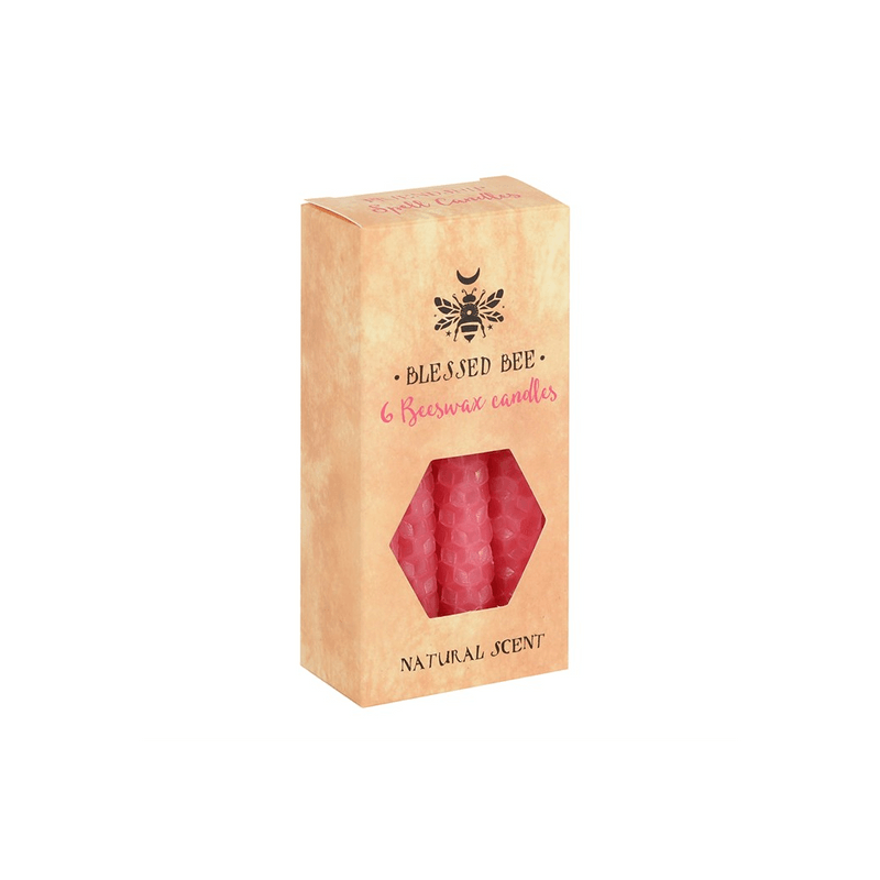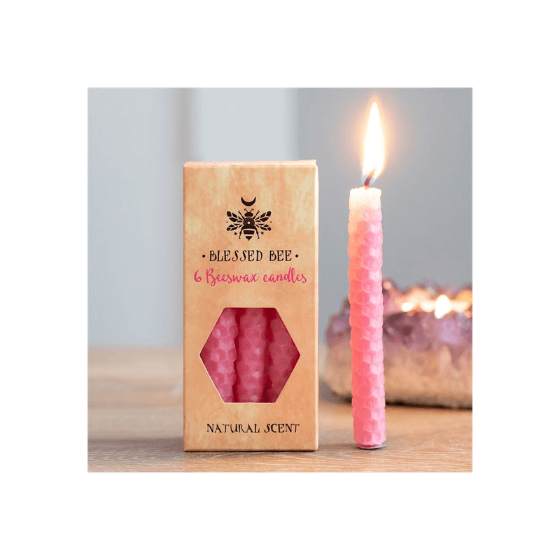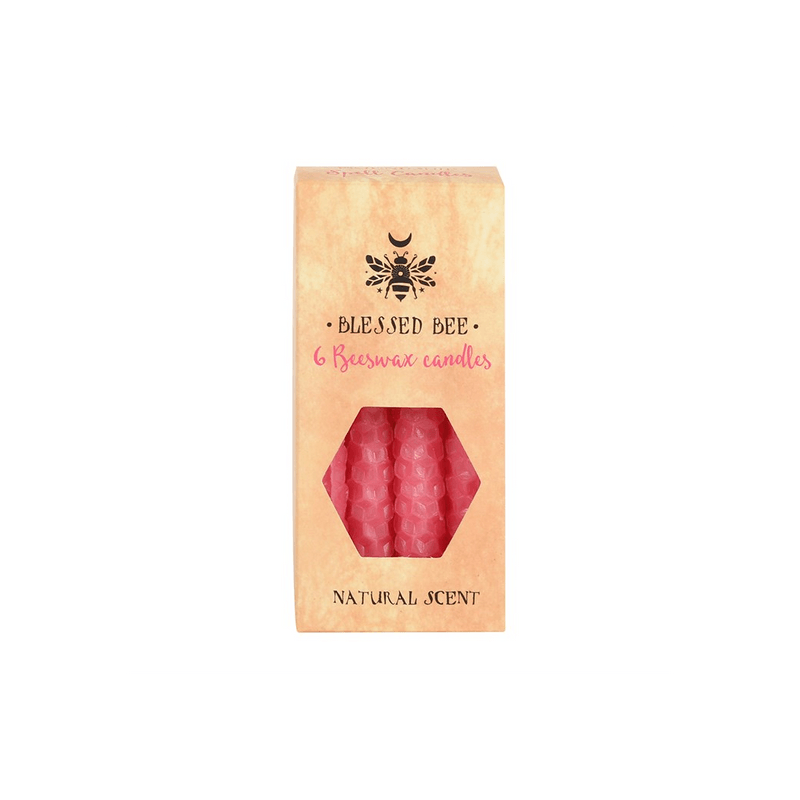A box of 6 pink Blessed Bee beeswax candles useful for spellwork involving love and friendship. Light, natural scent. Approximate burn time of 1 hour. 100% linen wick. Non-toxic. Product Dimensions: H11cm x W5.5cm x D3cm Packaged Dimensions: H11cm x W5.5cm x D3cm