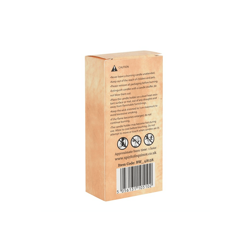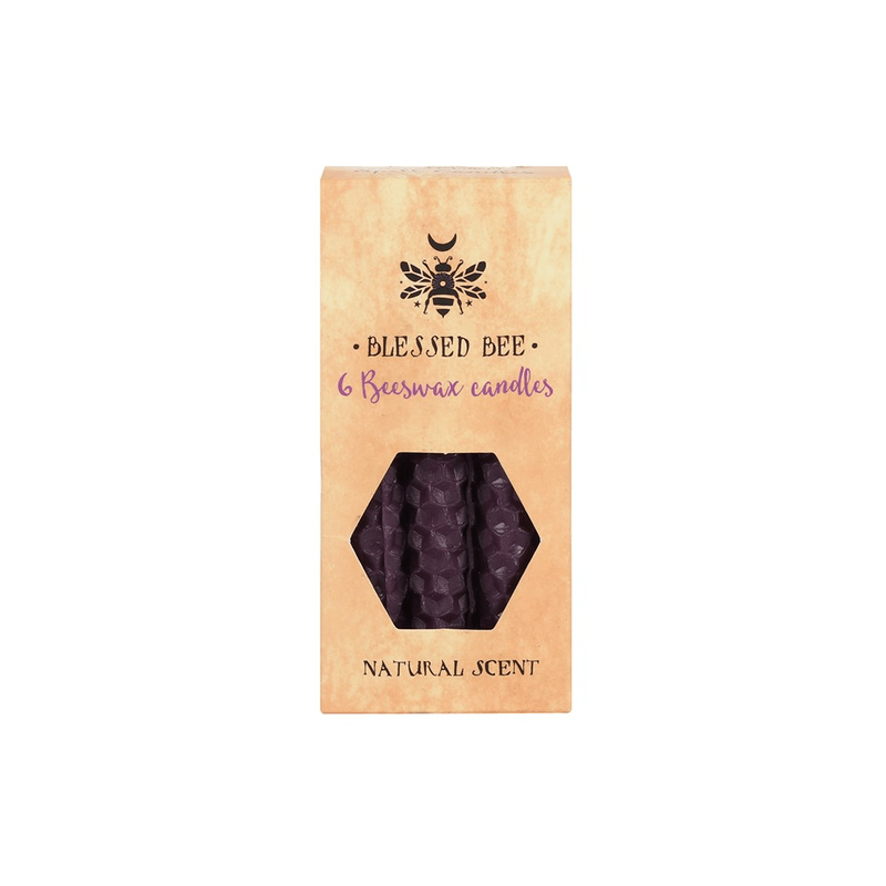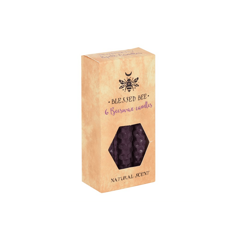 A box of 6 purple Blessed Bee beeswax candles useful for spellwork involving prosperity and overcoming obstacles. Light, natural scent. Approximate burn time of 1 hour. 100% linen wick. Non-toxic. Product Dimensions: H11cm x W5.5cm x D3cm Packaged Dimensions: H11cm x W5.5cm x D3cm