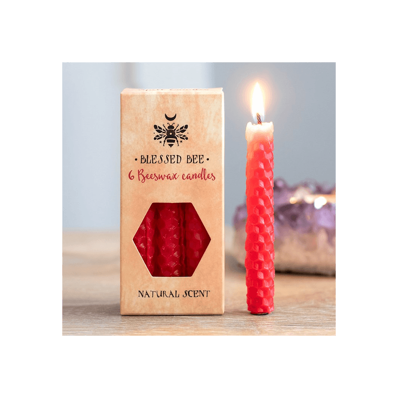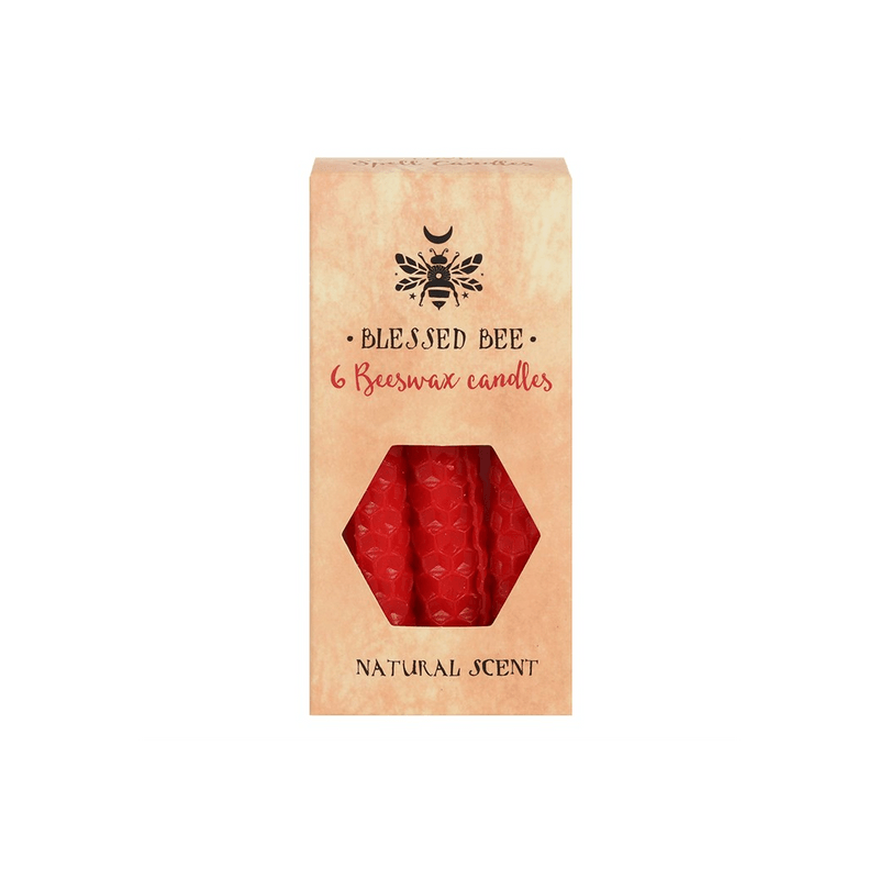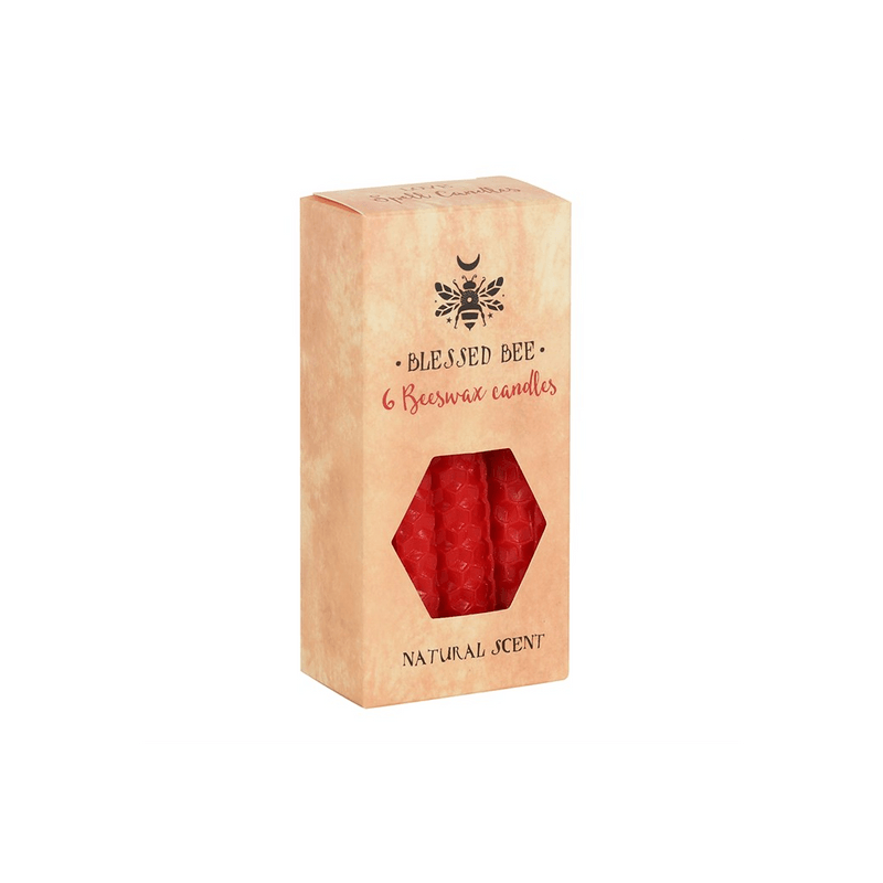 A box of 6 red Blessed Bee beeswax candles useful for spellwork involving love and courage. Light, natural scent. Approximate burn time of 1 hour. 100% linen wick. Non-toxic. Do not ingest. Product Dimensions: H11cm x W5.5cm x D3cm Packaged Dimensions: H11cm x W5.5cm x D3cm