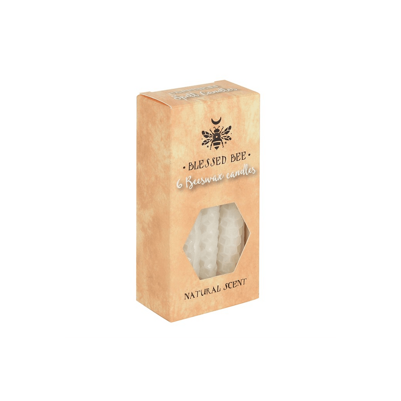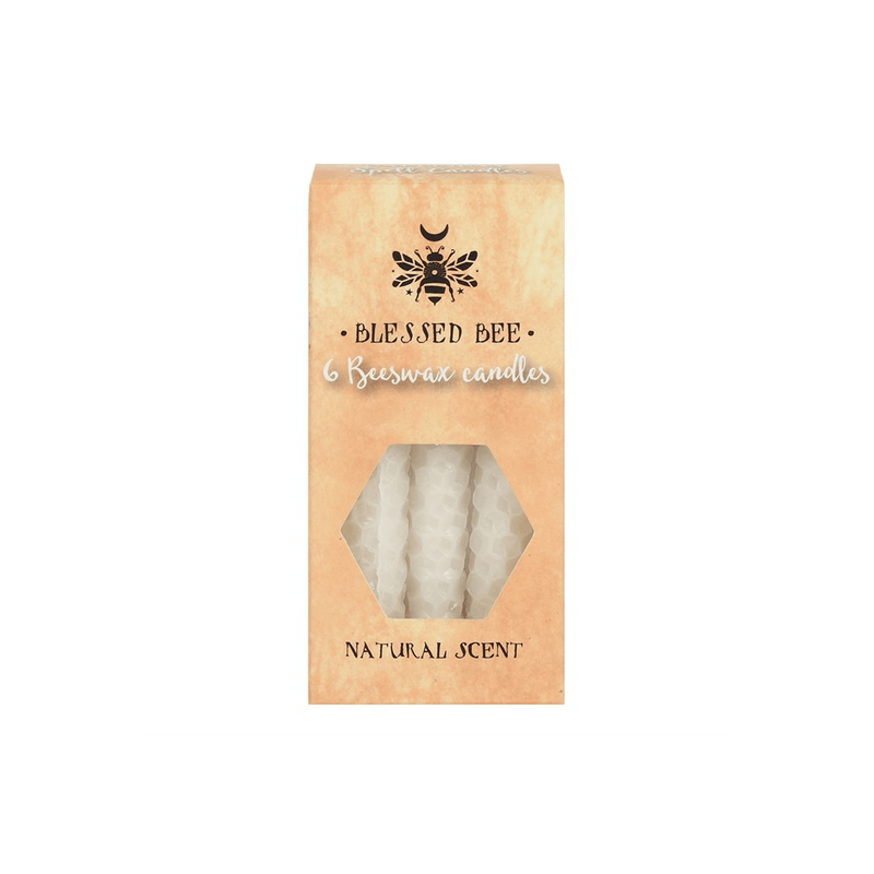 A box of 6 white Blessed Bee beeswax candles useful for spellwork involving peace and happiness. Light, natural scent. Approximate burn time of 1 hour. 100% linen wick. Non-toxic. Do not ingest. Product Dimensions: H11cm x W5.5cm x D3cm Packaged Dimensions: H11cm x W5.5cm x D3cm