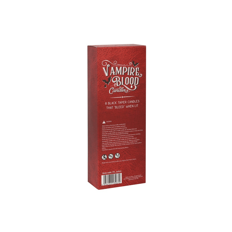 From candlelit dinners to eerie mood lighting, this set of Vampire Blood taper candles will entrance guests with their eye-catching, bleeding wax effect. Place these black and red candlesticks in an ornate candelabra for a truly bewitching display when the warm wax 'bleeds' down its sides. Sold in boxes of 8. Approximately 2 hour burn time per candle. Unscented paraffin wax. Protect surfaces before burning and never leave lit candles unattended. Product Dimensions: H25.5cm x W9cm x D4.5cm Packaged Dimensions: H25.5cm x W9cm x D4.5cm