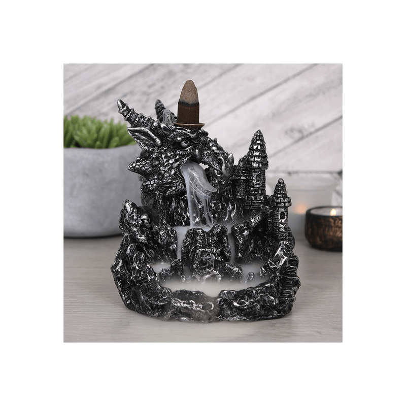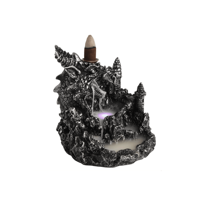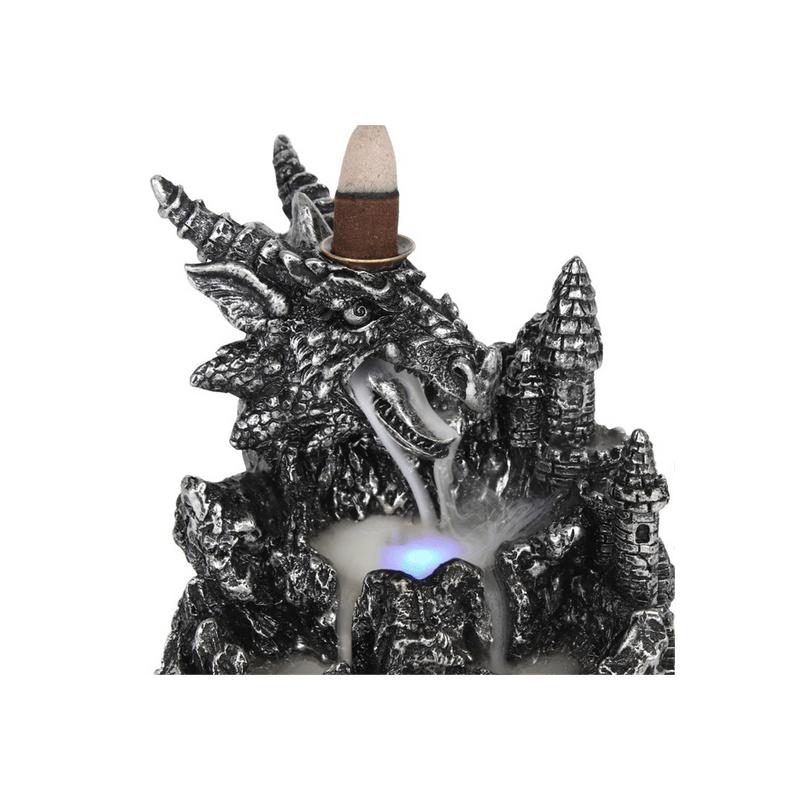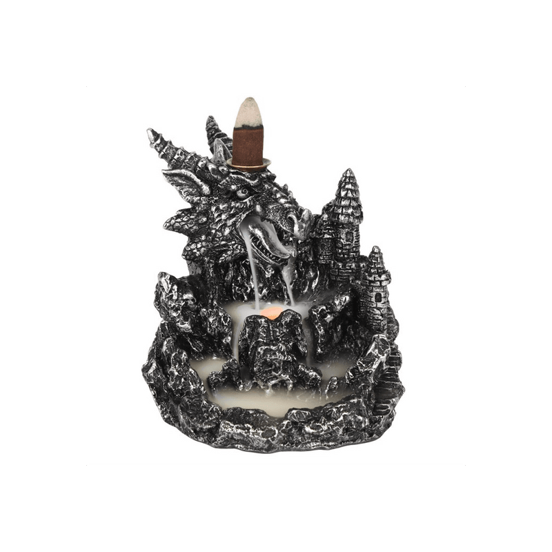 An intricate and captivating backflow incense burner in the Silver Dragon design. When the cone is lit the smoke from the cone cascades downwards, through the dragons nose in a mesmerising waterfall effect to pool at the bottom. Beautiful to watch. Colour changing light adds to the atmospheric design. For best effects burn indoors in an area away from any sudden air movements. Please note that after burning it is normal for a light oily residue to appear on the oil burner, for this reason we recommend protecting any furniture it is placed upon suitably. The residue can be easily wiped off the burner with a damp cloth. Please exercise caution when burning incense. Only backflow incense cones should be used with this product ? standard incense cones will not create the desired effect. It is normal for cones to take up to 10 minutes after being lit to start creating the smoking/mist effect. Product Dimensions: H13cm x W12.5cm x D12.5cm Packaged Dimensions: H16.5cm x W15.5cm x D15.5cm