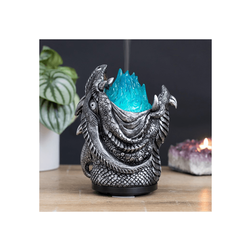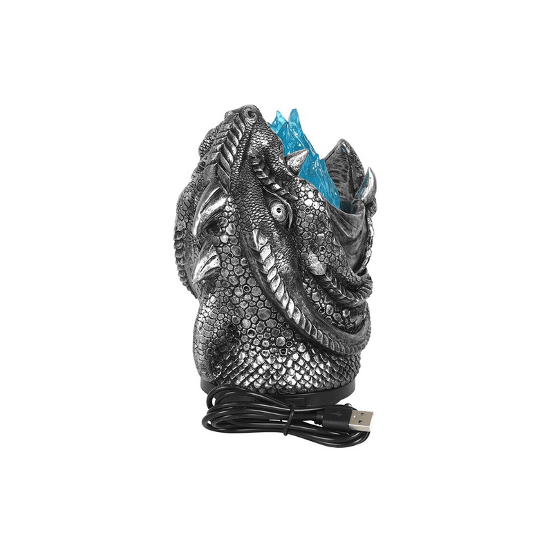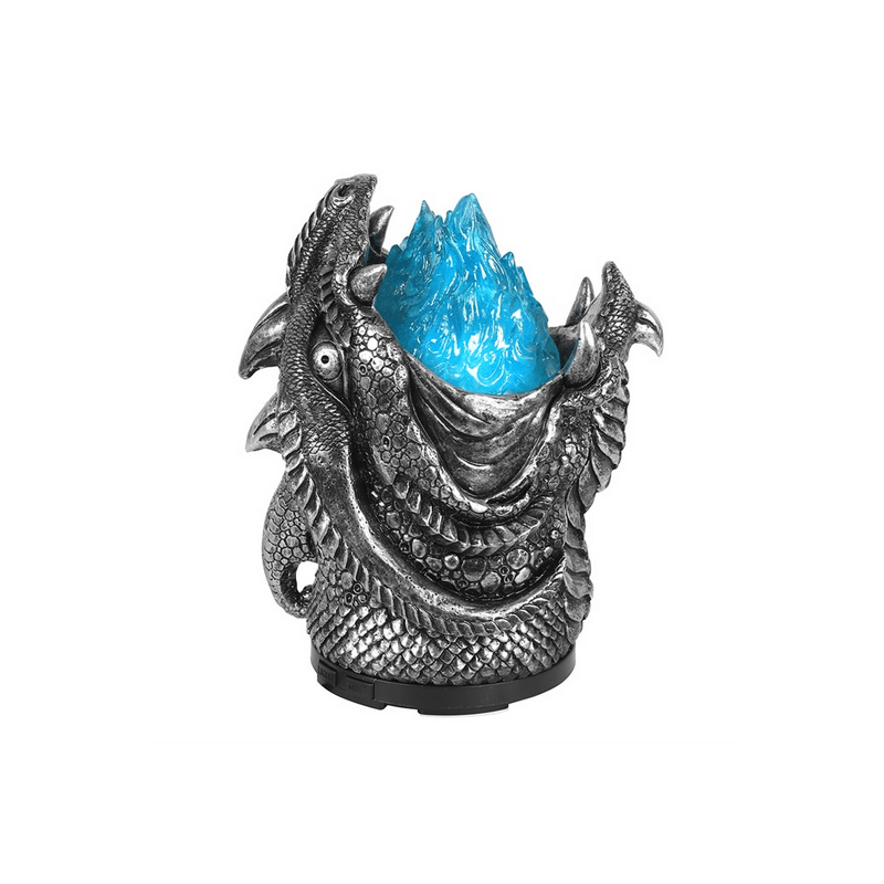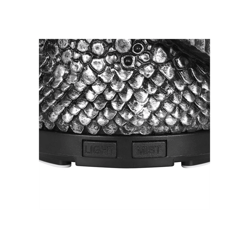 An amazing silver dragon head aroma diffuser that comes to life once when in use as the mist steadily rises from its mouth. Add a few drops of your favourite fragrance oil to some water and use the light and mist buttons to create your preferred effect. The diffuser has a 100ml liquid capacity, 4-6 hours runtime with auto shut-off feature. Power adapter and instructions included. Read instructions carefully before use. The diffuser has a 100ml liquid capacity, 4-6 hours runtime with auto shut-off feature. Power adapter and instructions included. Read instructions carefully before use.Product Dimensions: H18cm x W15cm x D11cm Packaged Dimensions: H22cm x W16.5cm x D15cm