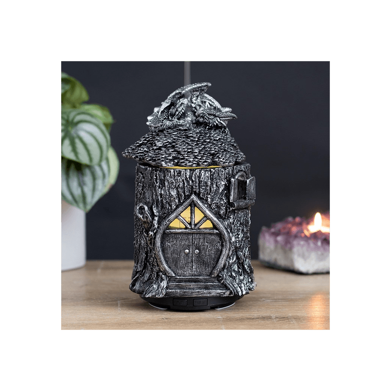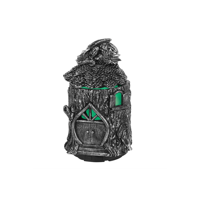 This fairytale inspired aroma diffuser features a silver dragon sleeping on top of a woodland treehouse with windows that emit a cosy glow when in use. Dilute your favourite fragrance oils with water and use the light and mist control buttons for your preferred effect. The diffuser has a 100ml liquid capacity, 4-6 hours runtime with auto shut-off feature. Power adapter and instructions included. Read instructions carefully before use. The diffuser has a 100ml liquid capacity, 4-6 hours runtime with auto shut-off feature. Power adapter and instructions included. Read instructions carefully before use. Product Dimensions: H19cm x W11.5cm x D11cm Packaged Dimensions: H23cm x W13.5cm x D14.2cm