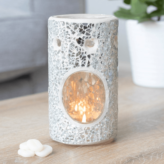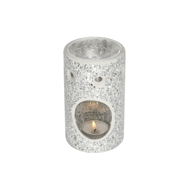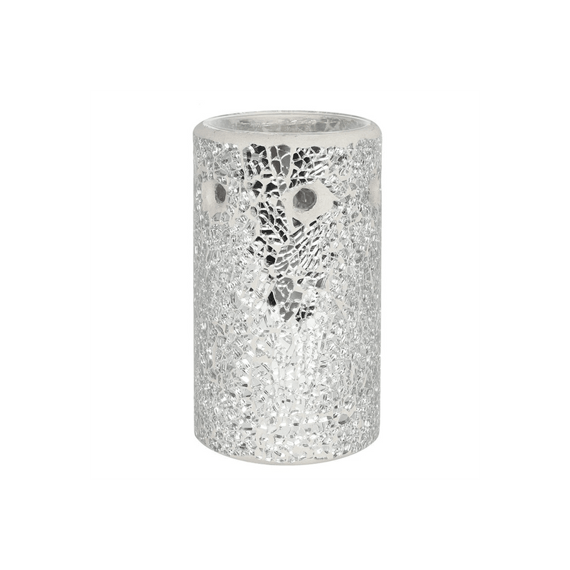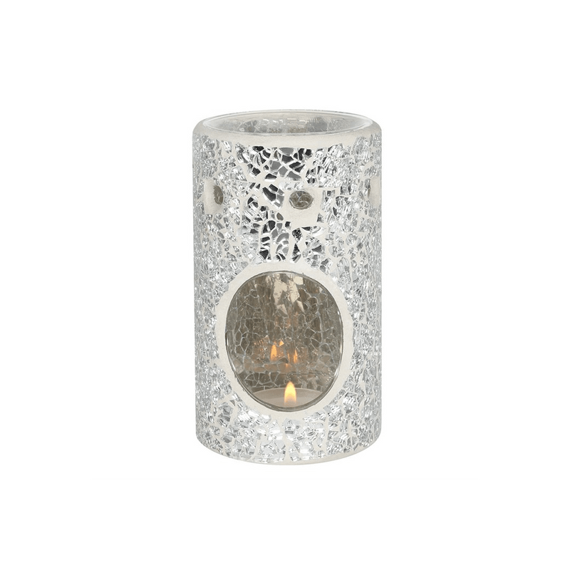 Stunning pillar shaped oil burner with a silver mirrored crackle effect. Would look beautiful in any home. This item can also be used as a wax melt burner however it is advisable to consider the size and depth of the bowl when adding wax to ensure it will not overrun the edges when melted. Product Dimensions: H14.5cm x W8cm x D8cm Packaged Dimensions: H16cm x W9.5cm x D9.5cm