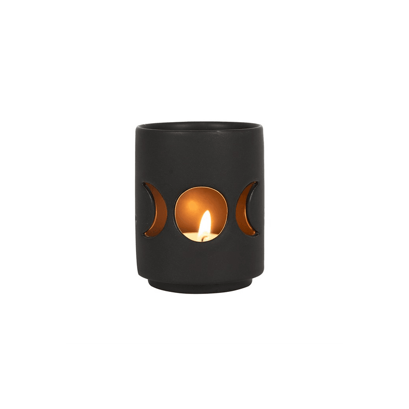 This ceramic tealight holder features a cutout triple moon design in a cool, matt black finish. The triple moon represents the stages of a woman's life; the mother, the maiden, and the crone. Holds one standard tealight candle. Product Dimensions: H7cm x W6cm x D6cm Packaged Dimensions: H9.5cm x W7.5cm x D7.5cm