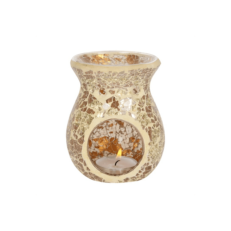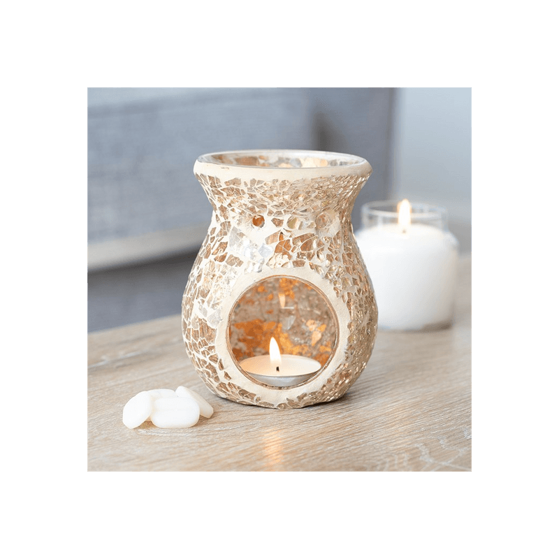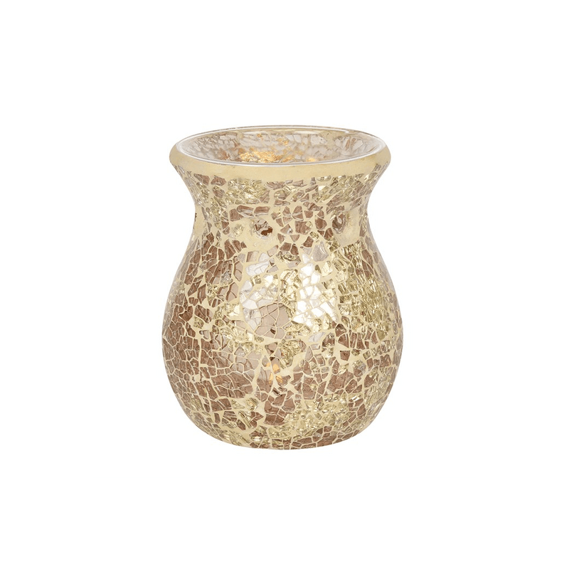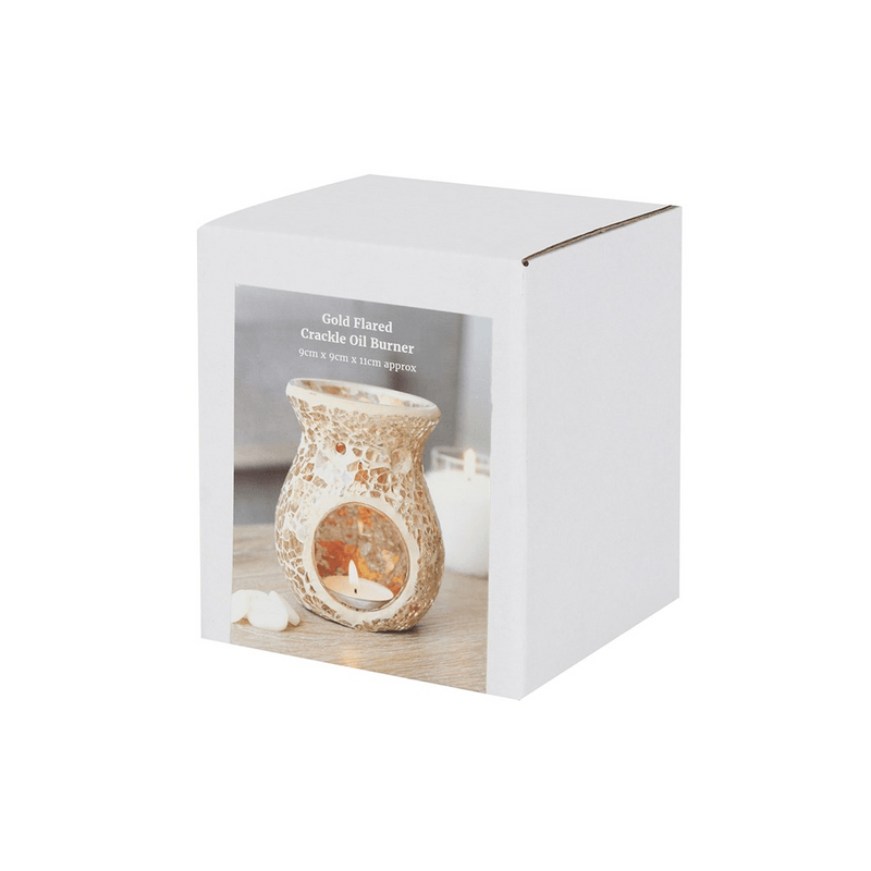 Stunning small oil burner with a gold mirrored crackle effect. Would look beautiful in any home. This item can also be used as a wax melt burner however it is advisable to consider the size and depth of the bowl when adding wax to ensure it will not overrun the edges when melted. Product Dimensions: H11cm x W8.5cm x D8.5cm Packaged Dimensions: H14cm x W11cm x D11cm
