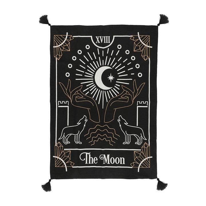 Create a statement with this tarot inspired tapestry depicting a design reflecting 'The Moon' card. Metallic gold and white ensure the design stands out and tassel corner details give this piece a premium feel. Product Dimensions: H64cm x W48cm x D0.25cm Packaged Dimensions: H32cm x W24cm x D1cm