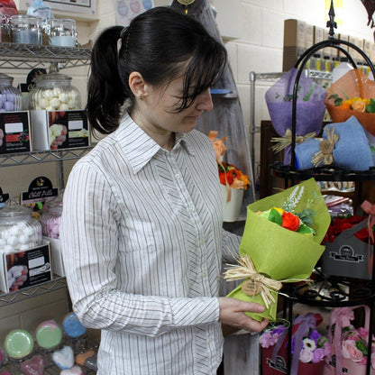 Looking for a unique and beautiful gift? Look no further than our Standing Soap Flower Bouquet! Our bouquets are artfully arranged and make a stunning presentation in a gift bag. Each bouquet contains 6 roses, 2 carnations, 2 sunflowers, and 1 hyacinth bean. Our Bath Flowers are a perfect gift for any occasion and are sure to delight!