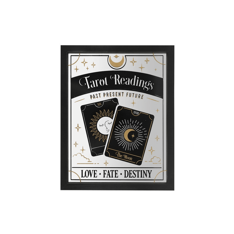 This mirrored wall hanging is sure to add mystery and whimsy to any trendy home. A mystical tarot card design is accented by gold foil, celestial details and tarot reading text. A truly magical piece to hang on a gallery wall. Product Dimensions: H45cm x W34cm x D1.25cm Packaged Dimensions: H47cm x W36cm x D2.2cm