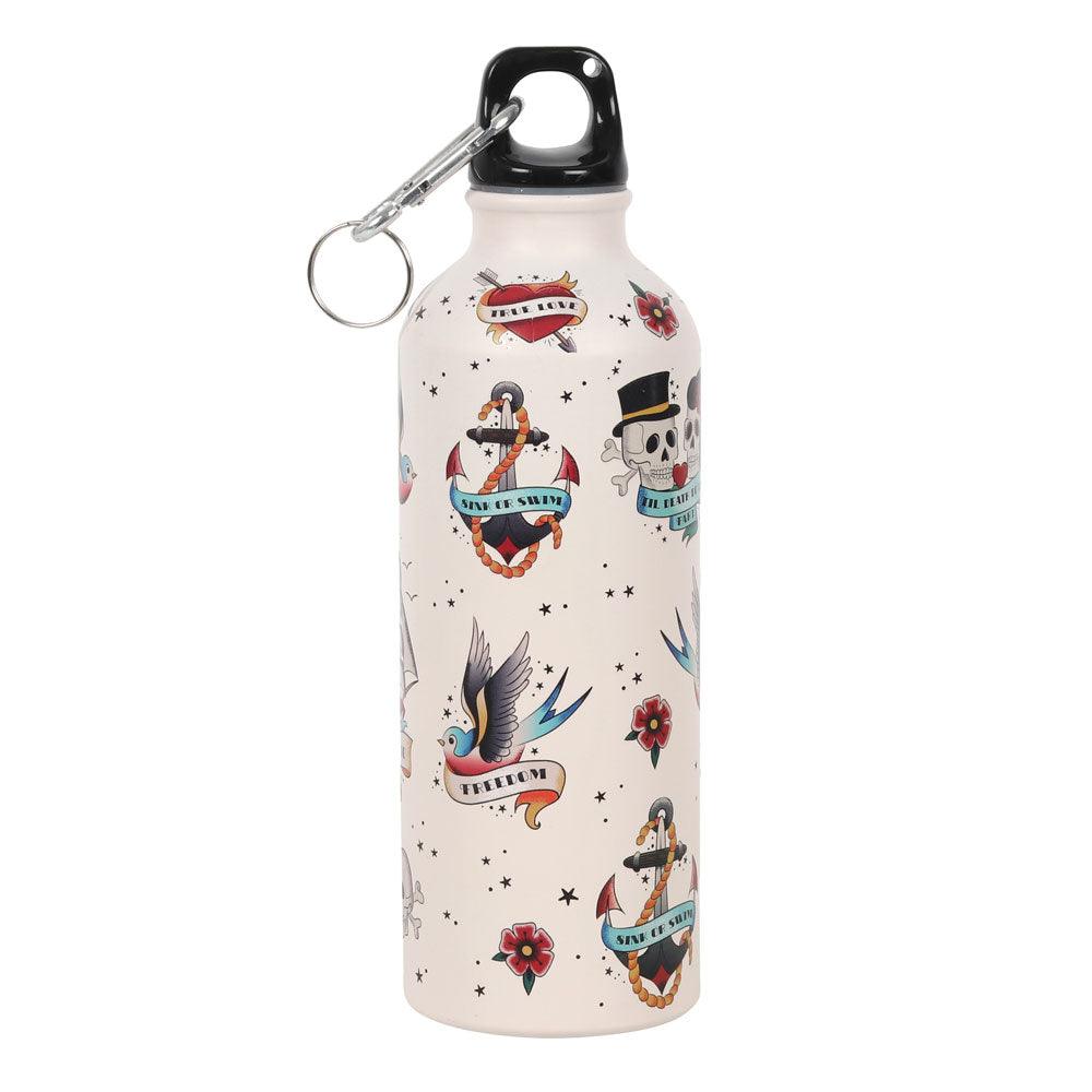 Ditch plastic water bottles for good with this lightweight metal water bottle featuring iconic tattoo designs like skulls, hearts, swallows and anchors. Product Dimensions: H21cm x W6.5cm x D6.5cm Packaged Dimensions: H21.7cm x W6.9cm x D6.9cm