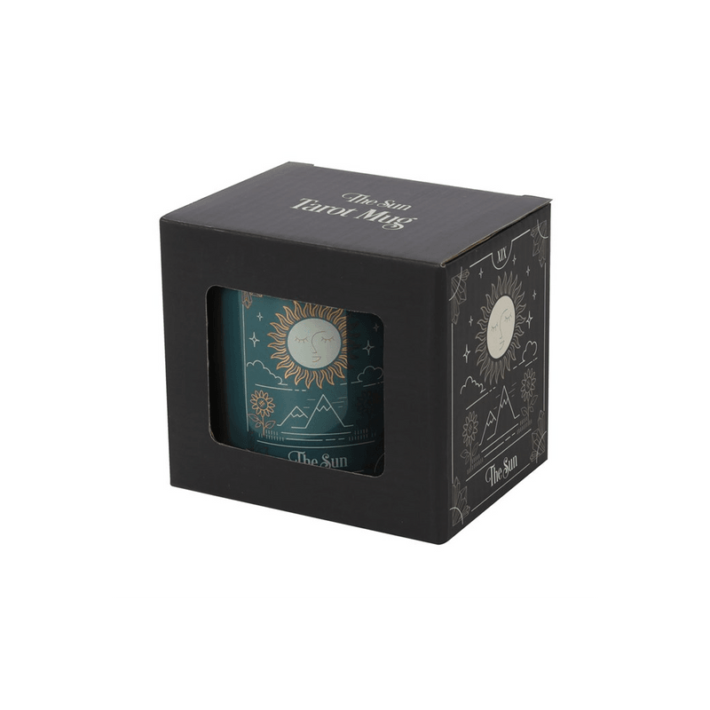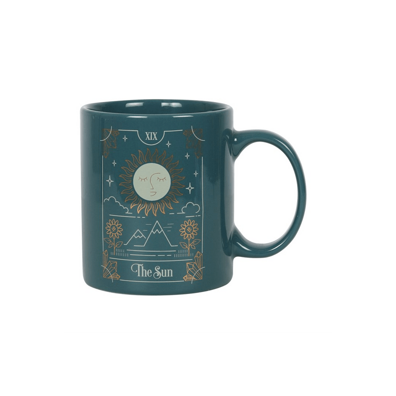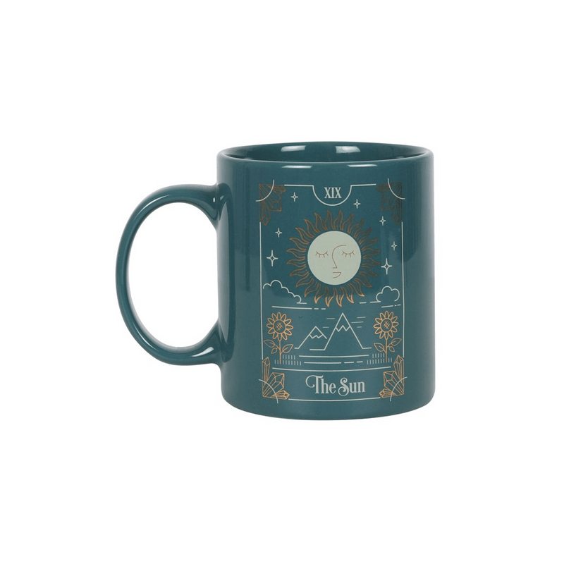 Start your day right with a cup of caffeine in this green mug featuring 'The Sun' tarot card illustration in white and metallic gold. Suitable for microwave and dishwasher use. Product Dimensions: H9.5cm x W12.3cm x D8cm Packaged Dimensions: H10.3cm x W11.5cm x D8.7cm