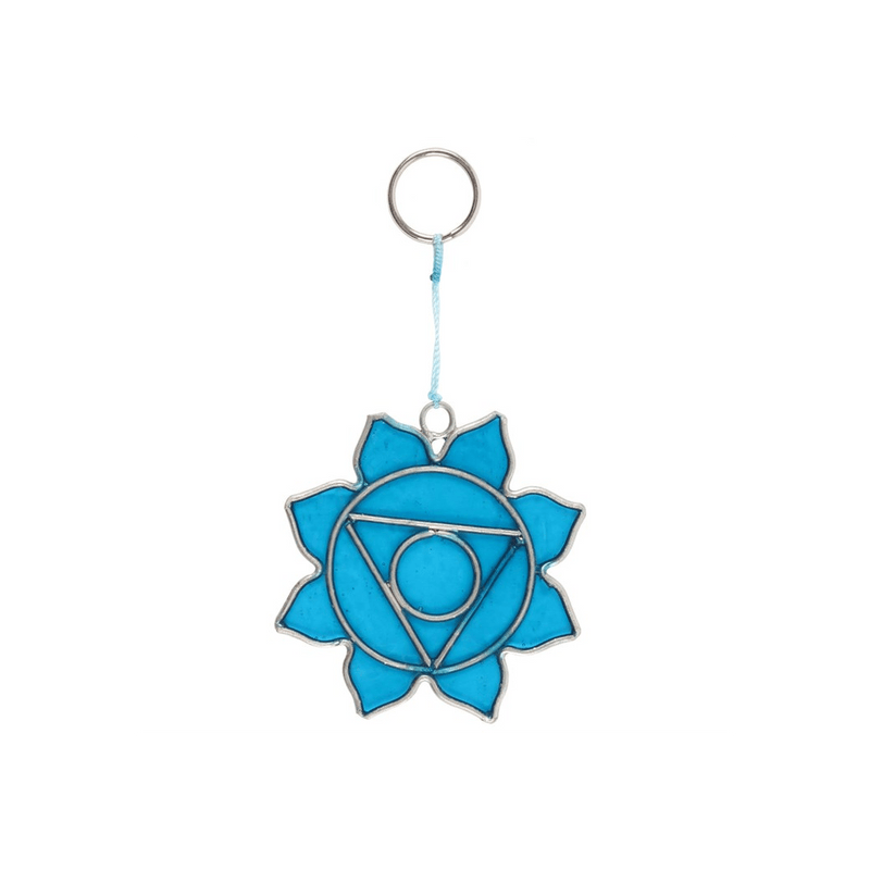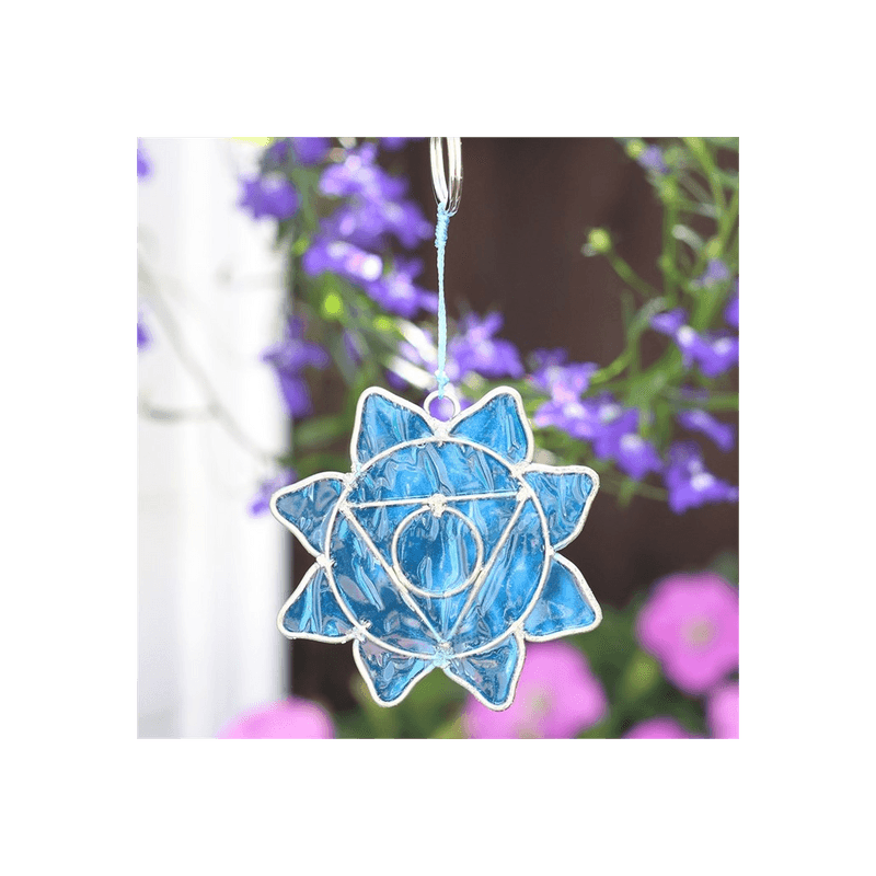 This mini suncatcher of the Throat Chakra symbol is designed to promote feelings of communications and creativity. Product Dimensions: H7cm x W6.5cm x D0.1cm Packaged Dimensions: H7.5cm x W7cm x D0.2cm