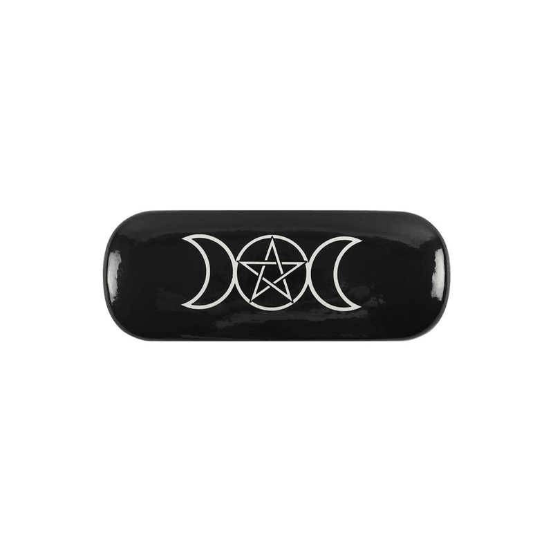 A black glasses case with simple, white Triple Moon and pentagram design. The case also comes with a handy cloth for cleaning glasses. Product Dimensions: H16cm x W6.5cm x D3.5cm Packaged Dimensions: H20cm x W9cm x D3.5cm