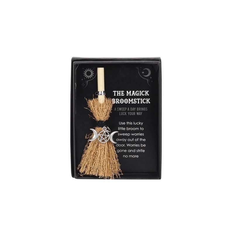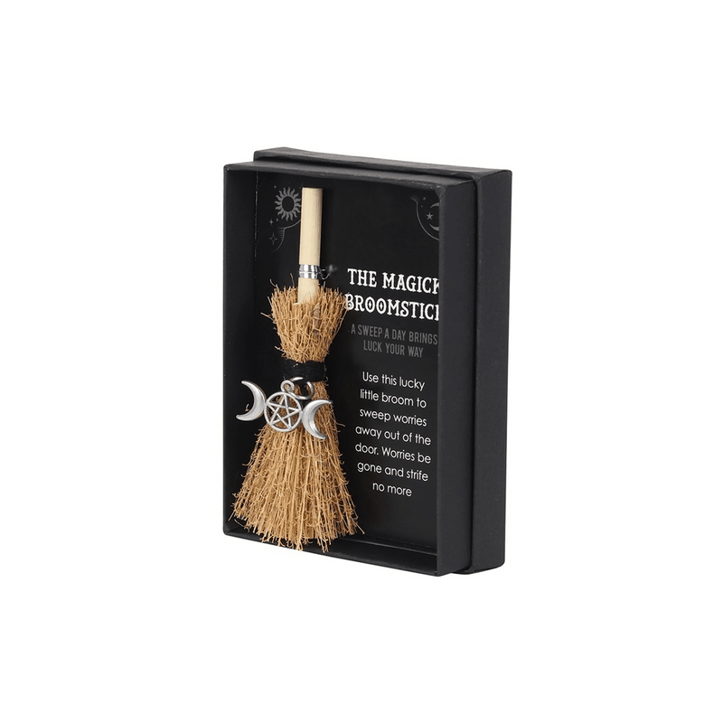 A mini broomstick charm with a message which reads 'A sweep a day brings luck your way'. Perfect for use during magic rituals, repetition of positive affirmations or just to carry with you every day to attract luck and positive energy. Product Dimensions: H10cm x W7.5cm x D1.5cm Packaged Dimensions: H11cm x W8cm x D3cm