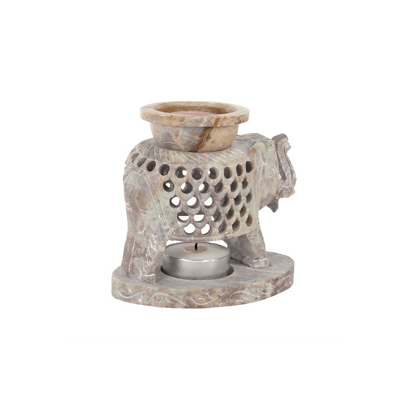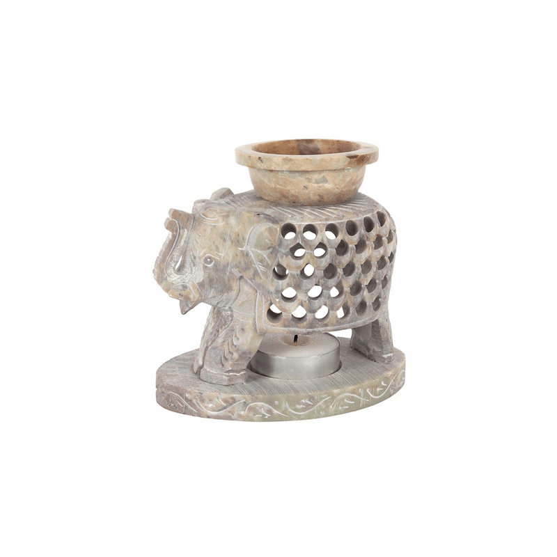 This soapstone oil burner and wax warmer is shaped like an elephant with an upturned trunk. Gently fragrance the home with oils or wax by placing a lit tealight underneath. Use with caution and do not leave unattended. Product Dimensions: H11cm x W10.5cm x D7cm Packaged Dimensions: H12cm x W11.5cm x D9cm