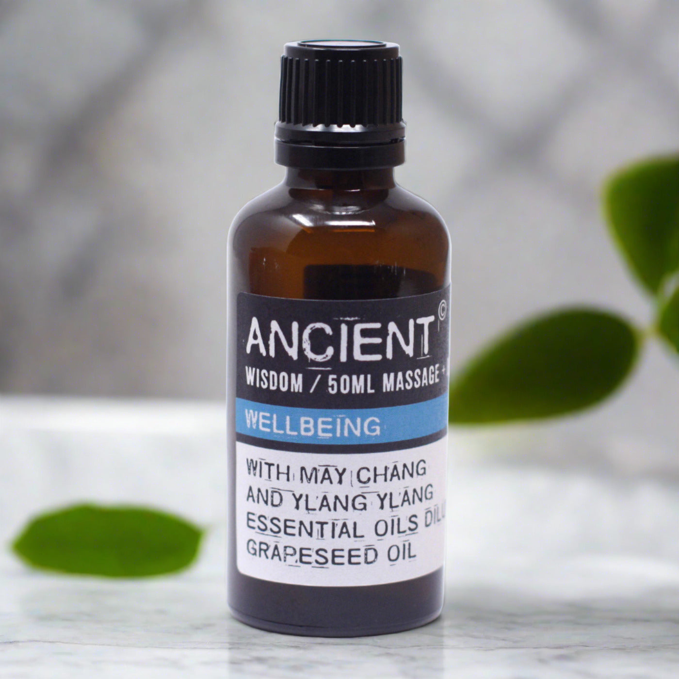 Your Wellbeing Massage Oil is made with worlds known Ancient Wisdom quality May Chang and Ylang Ylang Essential Oils and Pure Grapeseed Oil