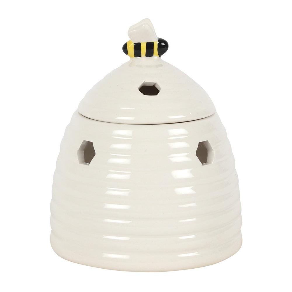Welcome to a place where honey, sweetness and beauty come together - introducing the White Beehive Oil Burner! This enchanting ceramic oil burner and wax warmer comes shaped in the alluring form of an adorable white beehive, finished off with a delicately detailed bee perched atop the lid. The honeycomb-shaped cutouts alongside its unique design enhance its appeal and charm.