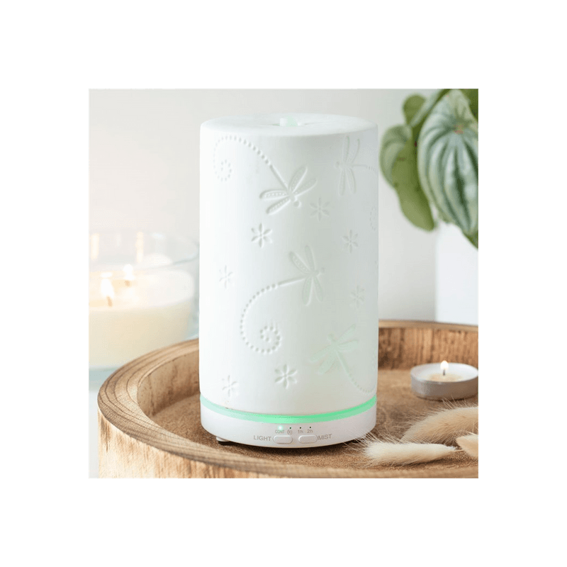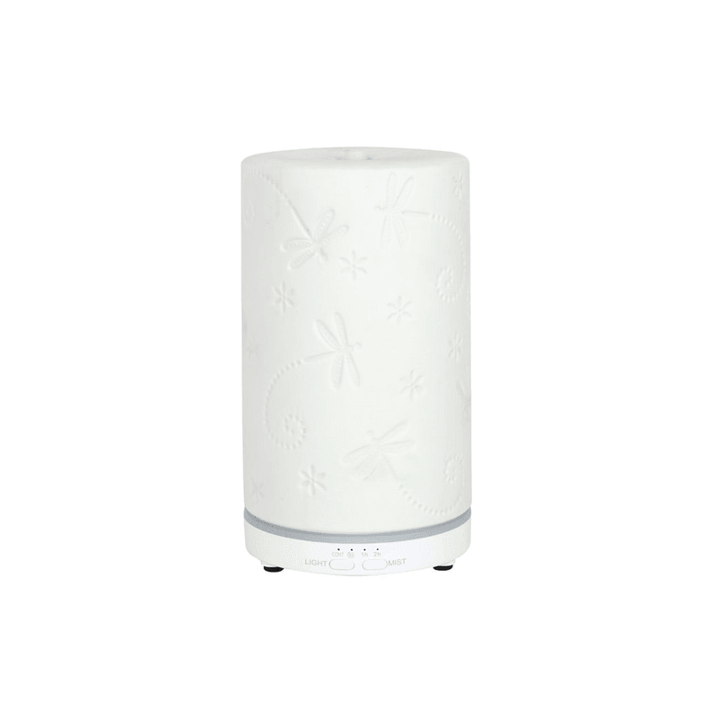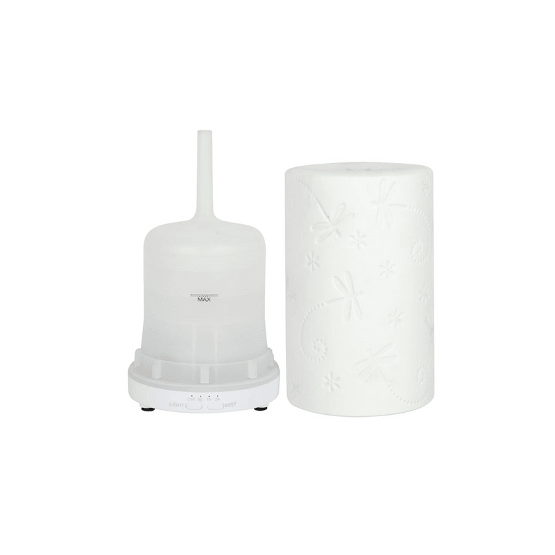 A beautiful white ceramic Dragonfly design electric aroma diffuser. Add drops of essential oil in the water tank to release the scent with the water vapour. Humidifiers are reported to have several health benefits including reducing snoring, dry coughs, asthma symptoms and allergies. Product Dimensions: H15.5cm x W9cm x D9cm Packaged Dimensions: H17.5cm x W11cm x D11cm