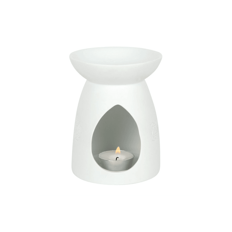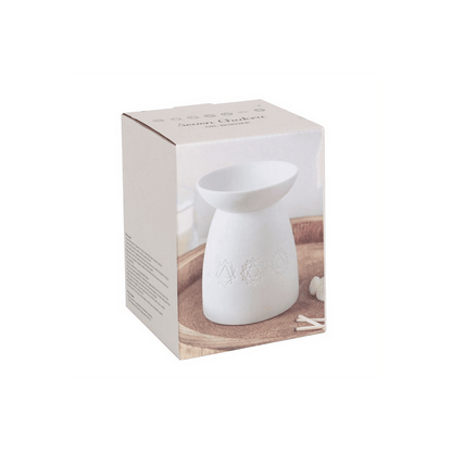 Timeless and elegant, this matte white oil burner features a subtle Seven Chakras design which is softly illuminated when a lit tealight candle is placed inside. Use with your favourite fragrance oils or wax melts to add beautiful scents to your home. Product Dimensions: H12.5cm x W9.5cm x D9.5cm Packaged Dimensions: H14.5cm x W11.5cm x D11.5cm
