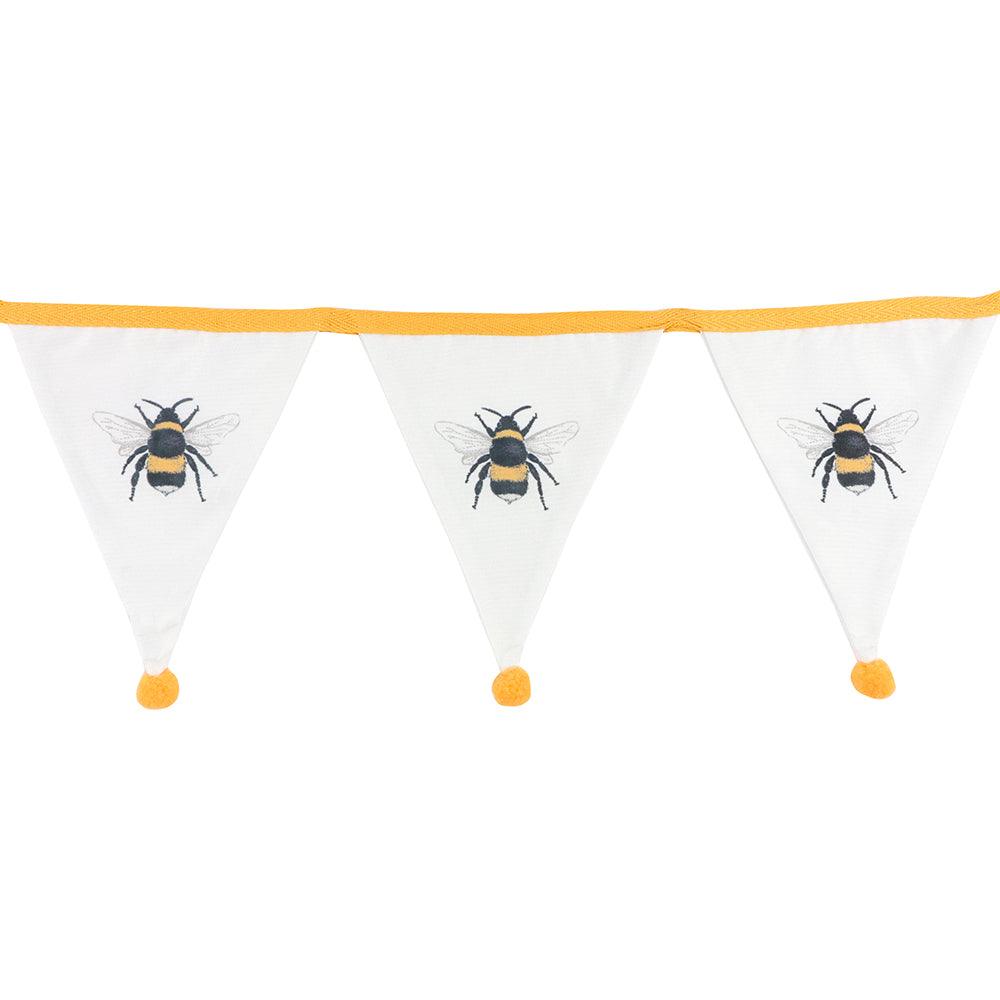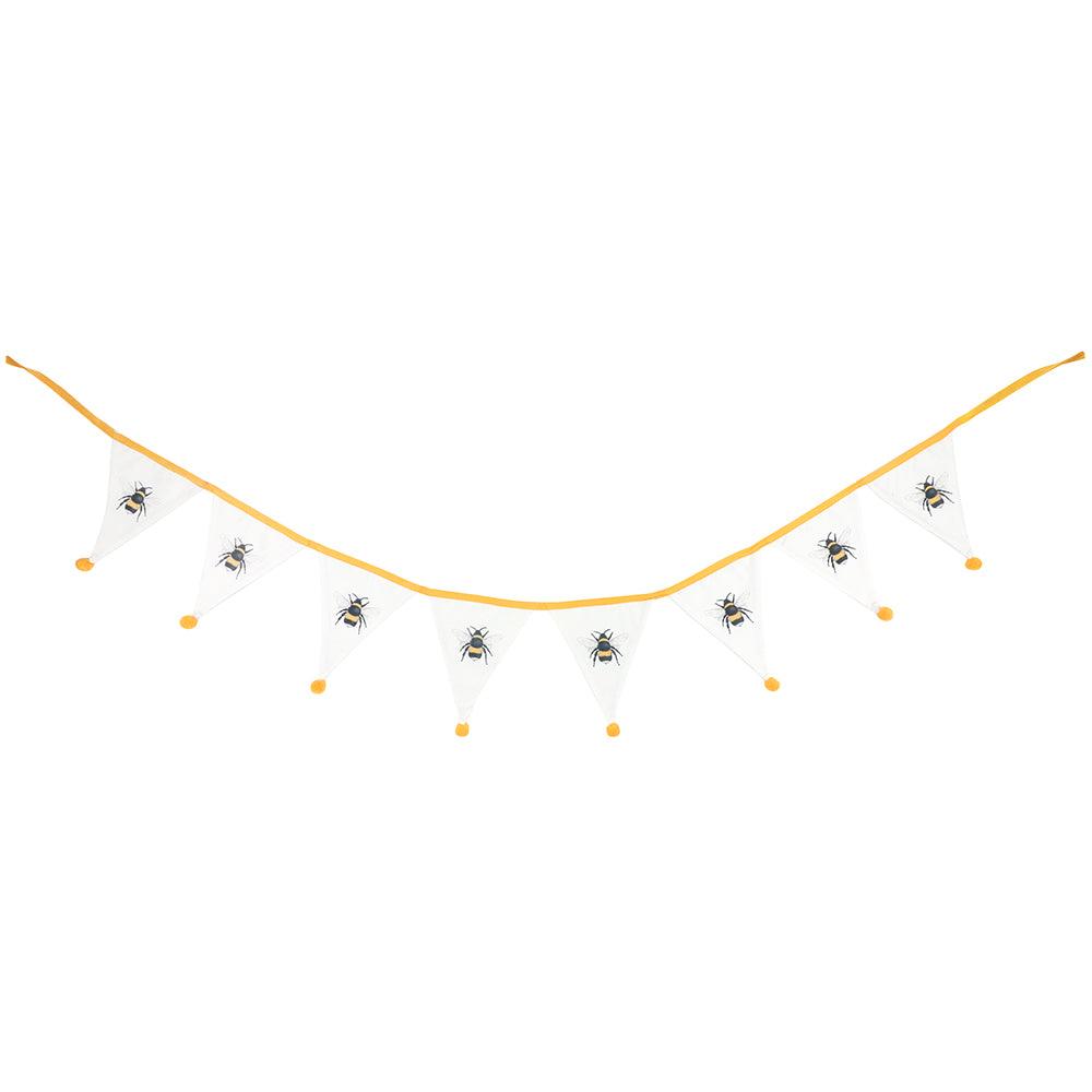 A decorative fabric bunting with a string of single bees on a white background and yellow pompom accents. Suitable for brightening up an indoor or outdoor space. Not recommended for long-term outdoor use or use during harsh weather. Polyester. Product Dimensions: H18cm x W160cm x D0.25cm Packaged Dimensions: H18cm x W15cm x D4cm
