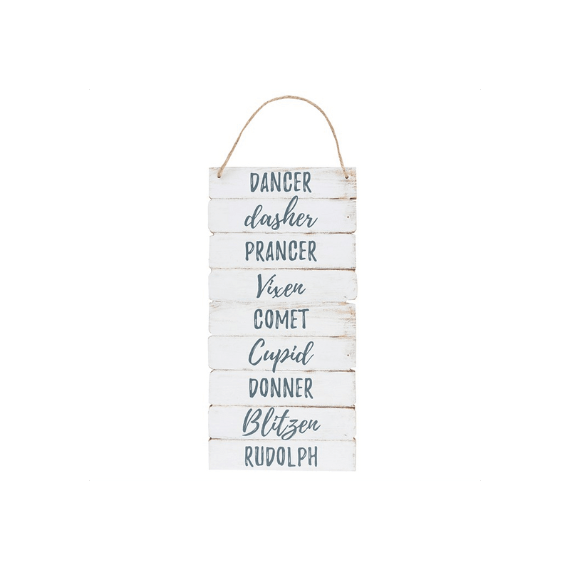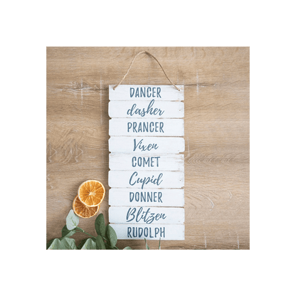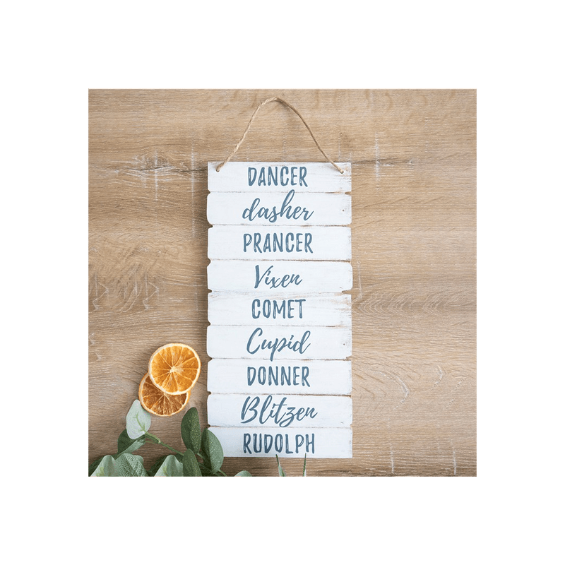 Create a winter wonderland in your home with this rustic white hanging sign featuring the names of Santa's trusty reindeer. Sure to spark joy in children and adults alike. Product Dimensions: H34cm x W17cm x D0.7cm Packaged Dimensions: H34cm x W17cm x D0.7cm