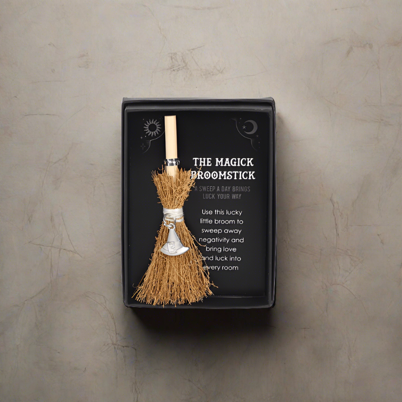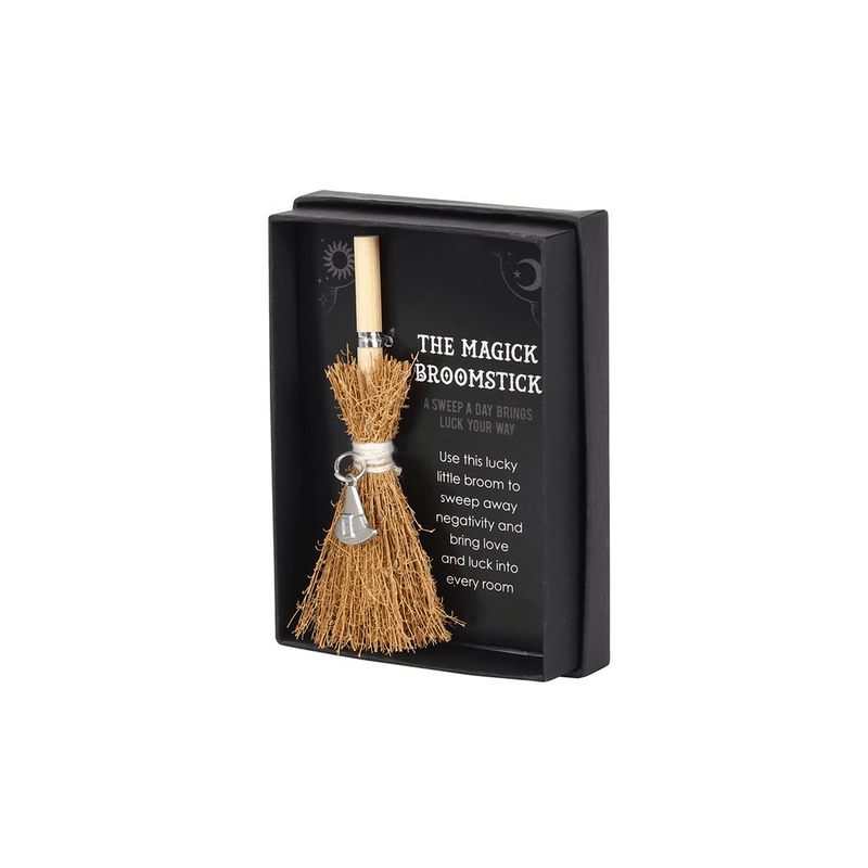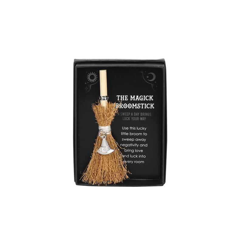 Attract luck and positive energy with this mini magic broomstick. Perfect in size for using on a mini altar, displaying on a kitchen shelf, keeping at a desk, or taking on the go for extra positivity. Features text that reads, 'A sweep a day brings luck your way. Use this lucky little broom to sweep worries away out of the door. Worries be gone and strife no more' and a silver tone triple moon charm. Product Dimensions: H11cm x W8cm x D3cm Packaged Dimensions: H3cm x W8cm x D11cm