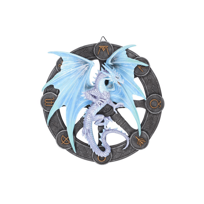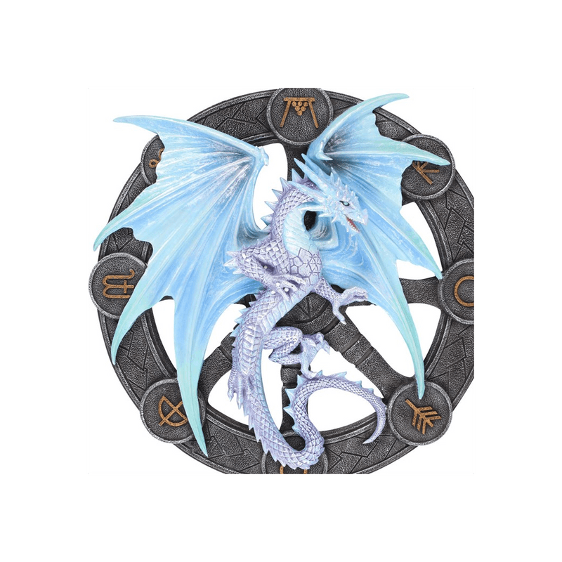 Experience the captivating beauty of the winter season with this stunning resin wall art plaque featuring the 'Yule' dragon artwork by renowned fantasy artist Anne Stokes. The 3D design showcases a circle of sabbat symbols and a magnificent blue ice dragon with razor sharp icicles for horns. The symbol for the Winter Solstice, Yule, is depicted above the dragon, and the intricate snowflake pattern on the dragon's scales and the ice shards in its breath add a touch of frosty magic. This awe-inspiring artwork is part of the 'Dragons of the Sabbats' series by Anne Stokes. Product Dimensions: H27cm x W26.7cm x D4cm Packaged Dimensions: H31.5cm x W31.5cm x D8.5cm
